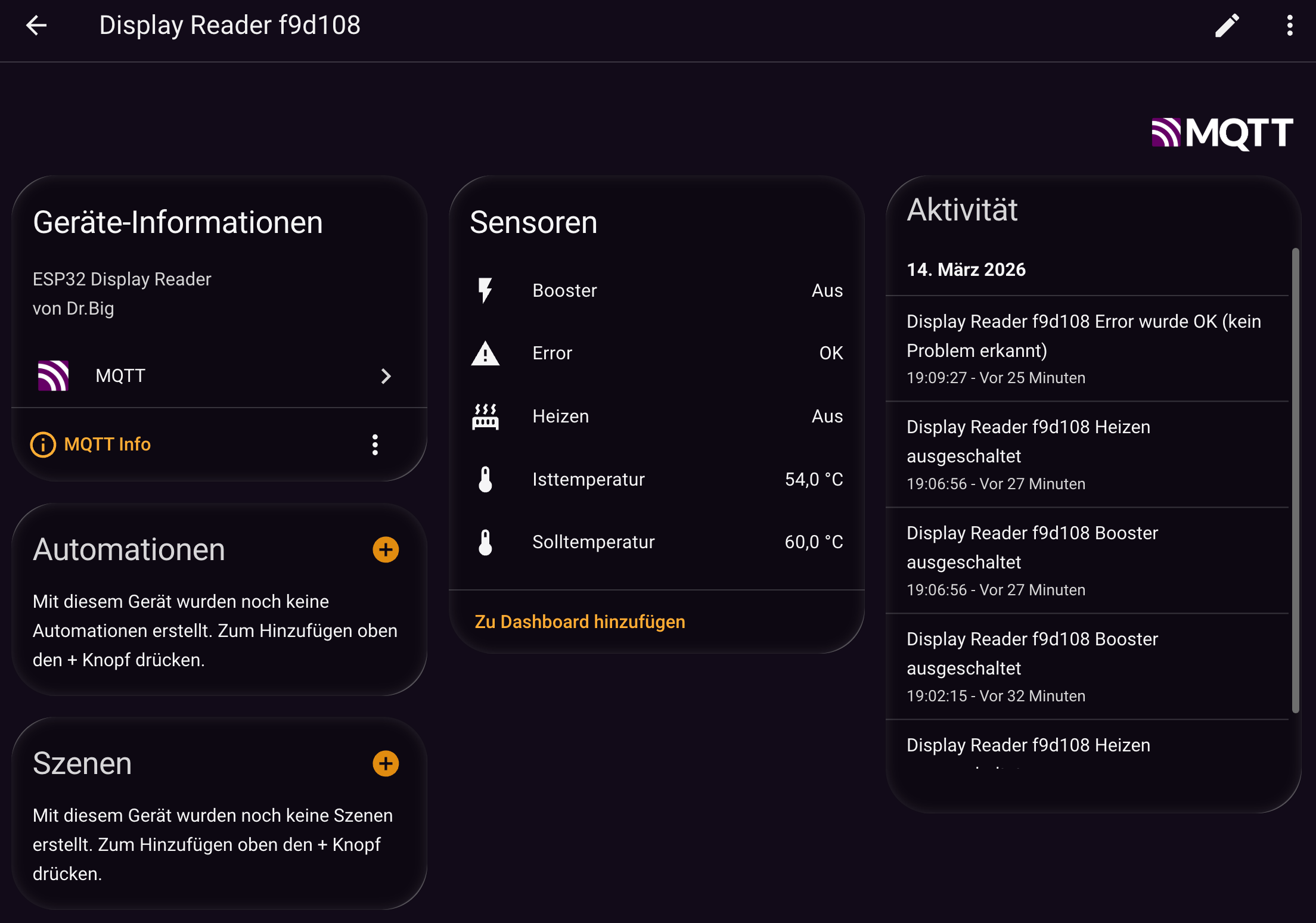 > Der ESP32 Display Reader ist ein kamerabasierter Sensor zum Auslesen von 7-Segment-Displays von GerĂ€ten wie WĂ€rmepumpen, Heizungen oder Energiesystemen bzw . alles was ein Display mit 7-Segmentanzeigen hat. > Eine ESP32-CAM fotografiert das Display, erkennt Zahlen und Symbole und ĂŒbertrĂ€gt die Werte per MQTT an Smart-Home-Systeme wie Home Assistant.