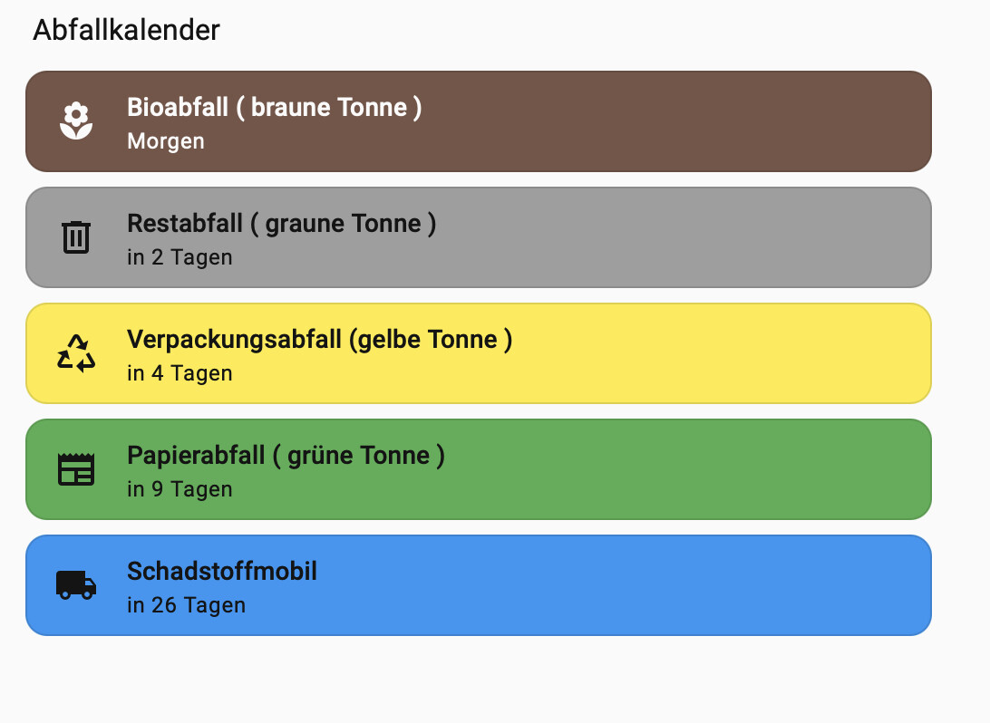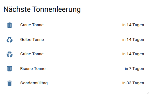 Leider habe ich es nur so hinbekommen, dass dort drin nur ein Termin angezeigt wird, allerdings habe ich an manchen Tagen in meinem Abfallterminkalender, dass mehrere MĂŒllarten abgeholt am gleichen Tag abgeholt werden.