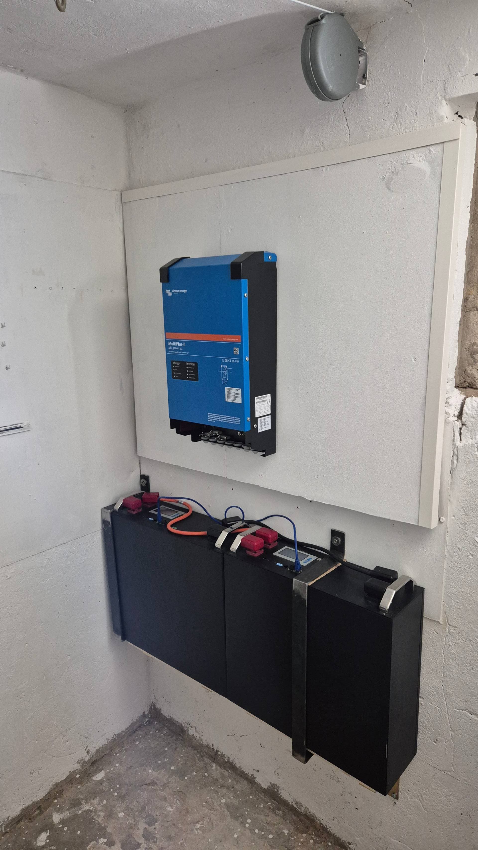 DarĂŒber wurde eine Konstruktion mit Rigips-Platten und Metallunterkonstruktion gebaut. Daran hĂ€ngt jetzt der MP2, natĂŒrlich dahinter entsprechend verstĂ€rkt. Zum Schluss wurde nochmal alles gestrichen. Jetzt kann die Verkabelung vom Speicher zum Victron erledigt werden und dann ist alle fertig.