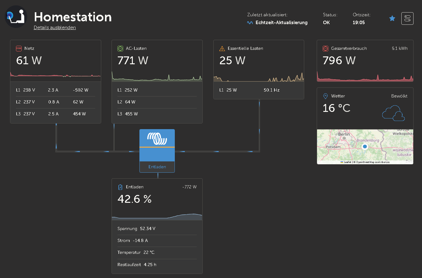 Heute war zum ersten Mal die neue Victron Anlage im Betrieb. Es funktioniert soweit alles wunderbar. Mal schauen was die nächsten Tage noch an Ertrag bringen, am Wochenende soll ja nochmal sehr schönes Wetter werden.