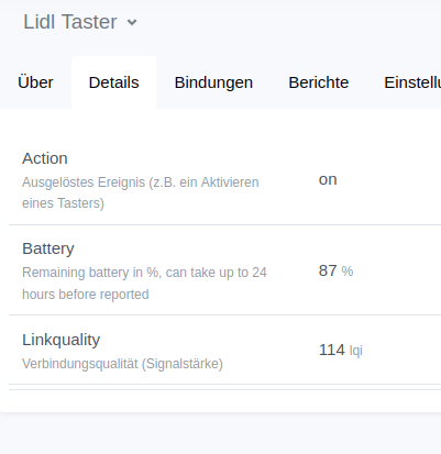 Eben doch! Ich kann Dir versichern das mein Lidl Zigbee Taster als ein Schalter eingebunden war. Einfacher Klick âausâ Doppelklick âeinâ. Ganz normal als EntitĂ€t, so wie man es eigentlich unkompliziert braucht. Ich hatte damit meinen Shelly an der AV Stromversorgung verknĂŒpft, deswegen bin ich mir sicher. Dieser Schalter kommt nicht mehr vor, ich habe nur noch Batterie, Lastseen und Linkquality.
