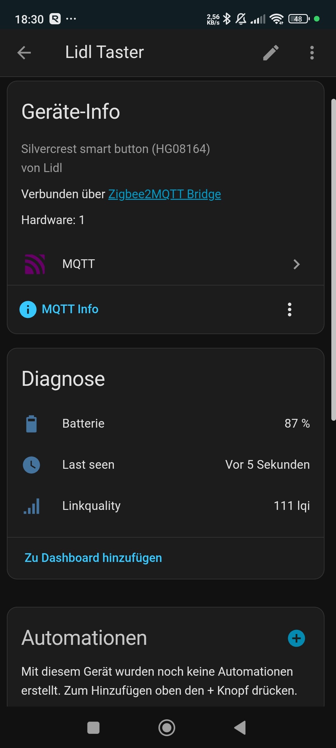Ne der Screenshot ist vom homematic Taster, sieht bei mir auch so aus. Beim Zigbee Taster ist da keine EntitĂ€t mehr fĂŒr den Taster vorhanden bzw. hinterlegt. Das hatte uns gewundert, denn wir denken da war mal ein Taster, weiĂ es aber halt auch nicht mehr genau.