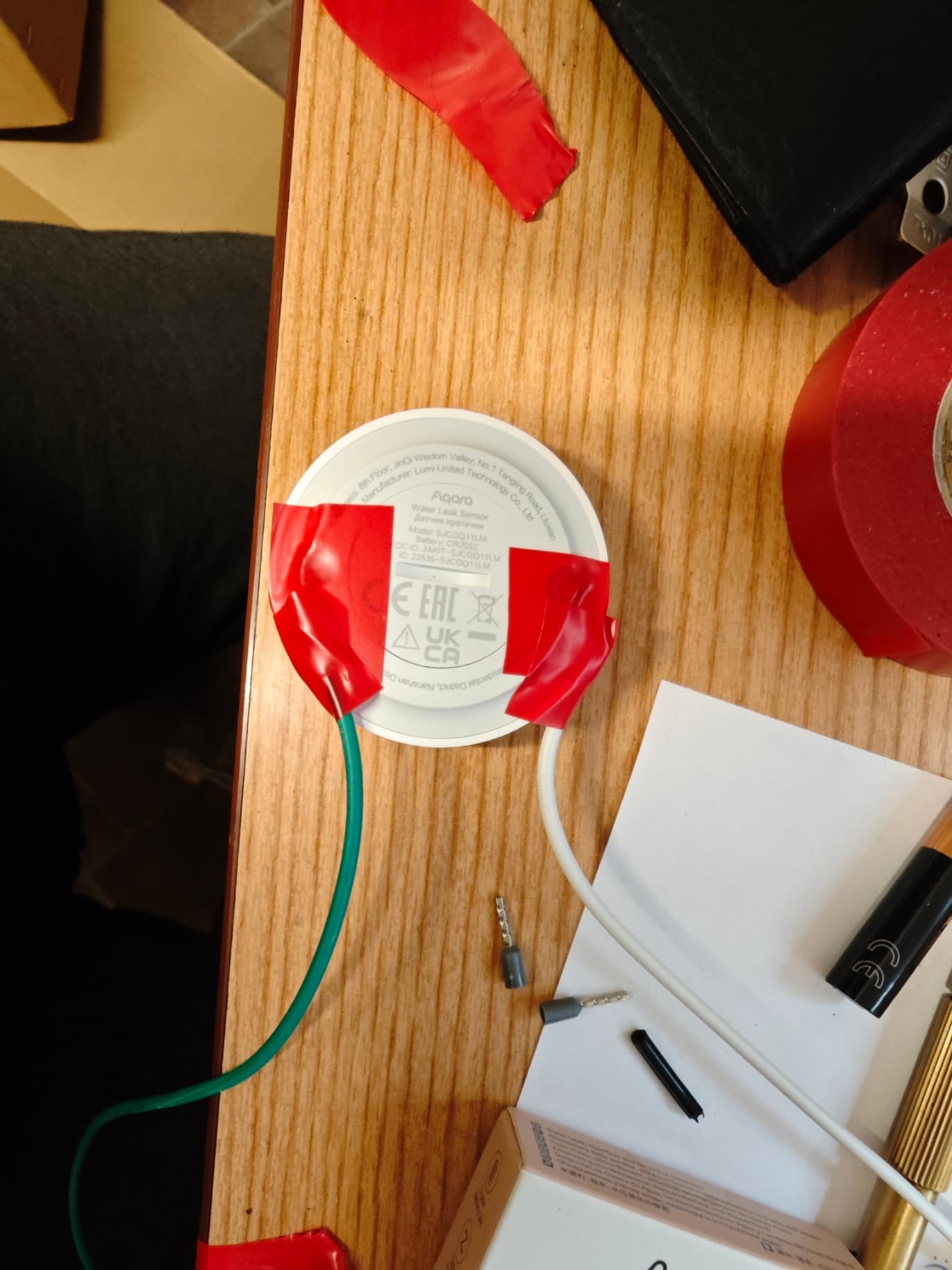 Im Kasten steht eine Tauchpumpe, hin- und wieder hÀngt der Schimmer, also musste eine Warnung her, das erledigt jetzt ein Wasserlecksensor.