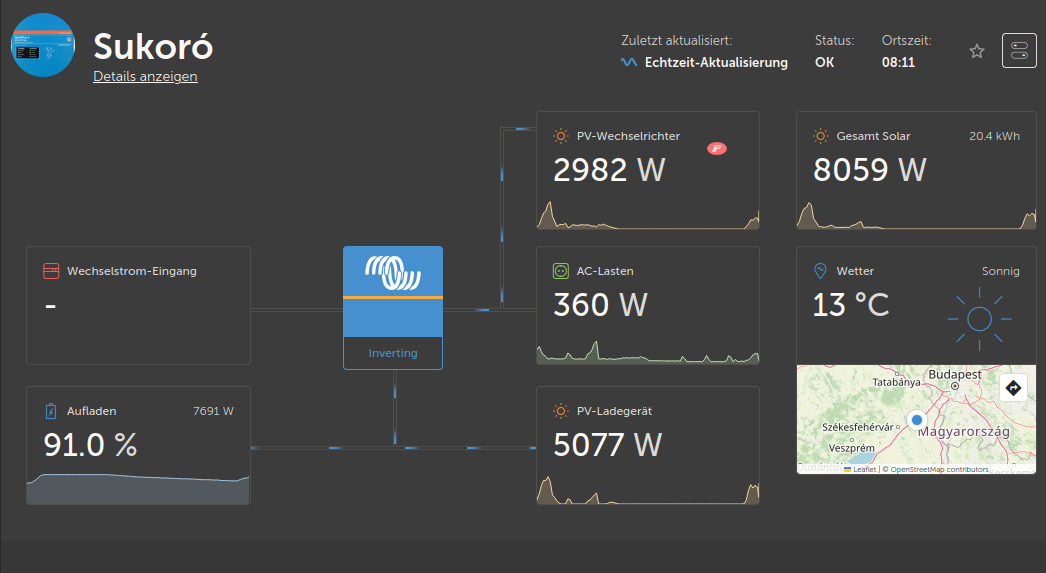 Heute noch ein paar Einstellungen gemacht beim Fronius WR im CarPort damit der Fronius besser geregelt wird und man weniger Verluste hat. So wie es aussieht hat es gefruchtet und regelt besser! Wenn der Akku voll wird, wird der Fronius nicht mehr ganz abgregelt sonder so das er den Hausverbrauch abdeckt und nicht die MPPTâs die Wandlungsverluste haben, durch das der Strom zuerst in den Multiplus gehen und von dort von DC in AC gewandelt wird und dann erst zu den Verbraucher.