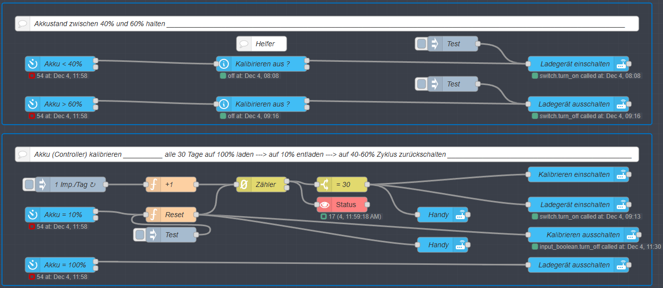 Der Akku-Ladestand wird zwischen 40% und 60% gehalten, indem die SmartPlugs vor den LadegerÀten entsprechend ein- und ausgeschaltet werden. So wird Tiefentladung und die ebenso ungesunde Vollladung vermieden.