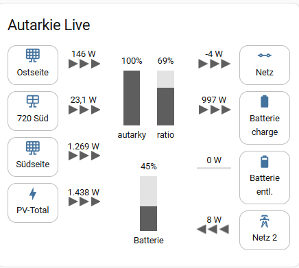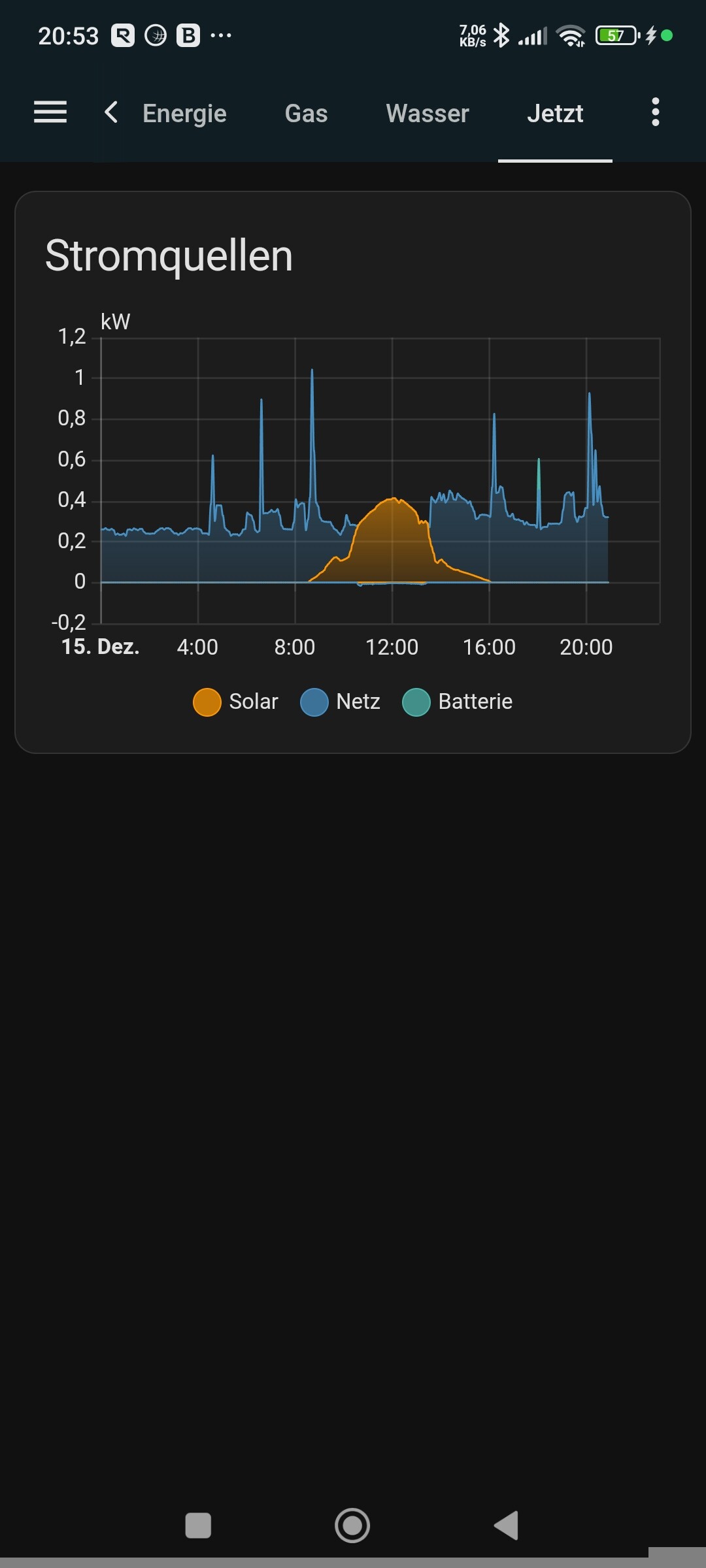 Ich habe heute ein die neuen Möglichkeiten des Energie Dashboard ausprobiert. Finde ich nice. Auch wenn in der Grafik, der aus dem Hausstromnetz in den Akku gepufferte Strom, fehlt. Der BKW Speicher war fĂŒr HA unerreichbar. Ursache unbekannt. Die HA Integration kommt von einem Drittanbieter, Solakon, der Speicher selbst von Tepto. Beides Distributoren. Bis auf Kleinigkeiten sind die Speicher Baugleich. Mein Verdacht ist das die Cloudsoftware von Foxx (Hersteller) und die lokale Schnittstelle ĂŒber Modbus sich nicht vertragen. Ist aber nur ein BauchgefĂŒhl.