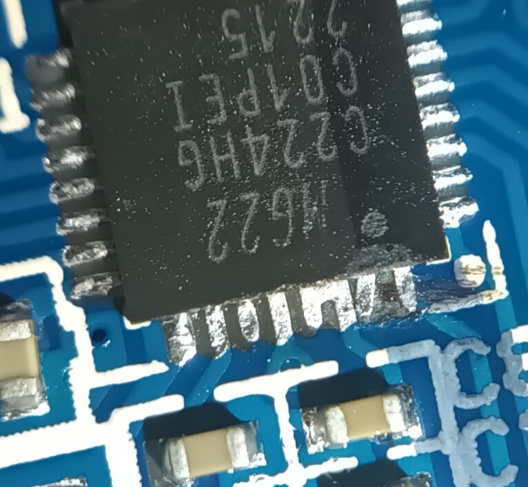 Einmal entlötet und genauer betrachtet. So wie es aussieht gehören die beiden Beine verbunden⊠Hab die Seite einmal vom Lötzinn befreit. Allerdings habe ich das mit HeiĂluft nicht hinbekommen. Damit habe ich bisher USB Buchsen, Mosfets und so ein Zeug gemacht. Also klassisch mit Lötkolben und Entlötlitze gebrutzelt. Bei dem Anblick habe ich gedacht das ich das Ding gehimmelt habe.
