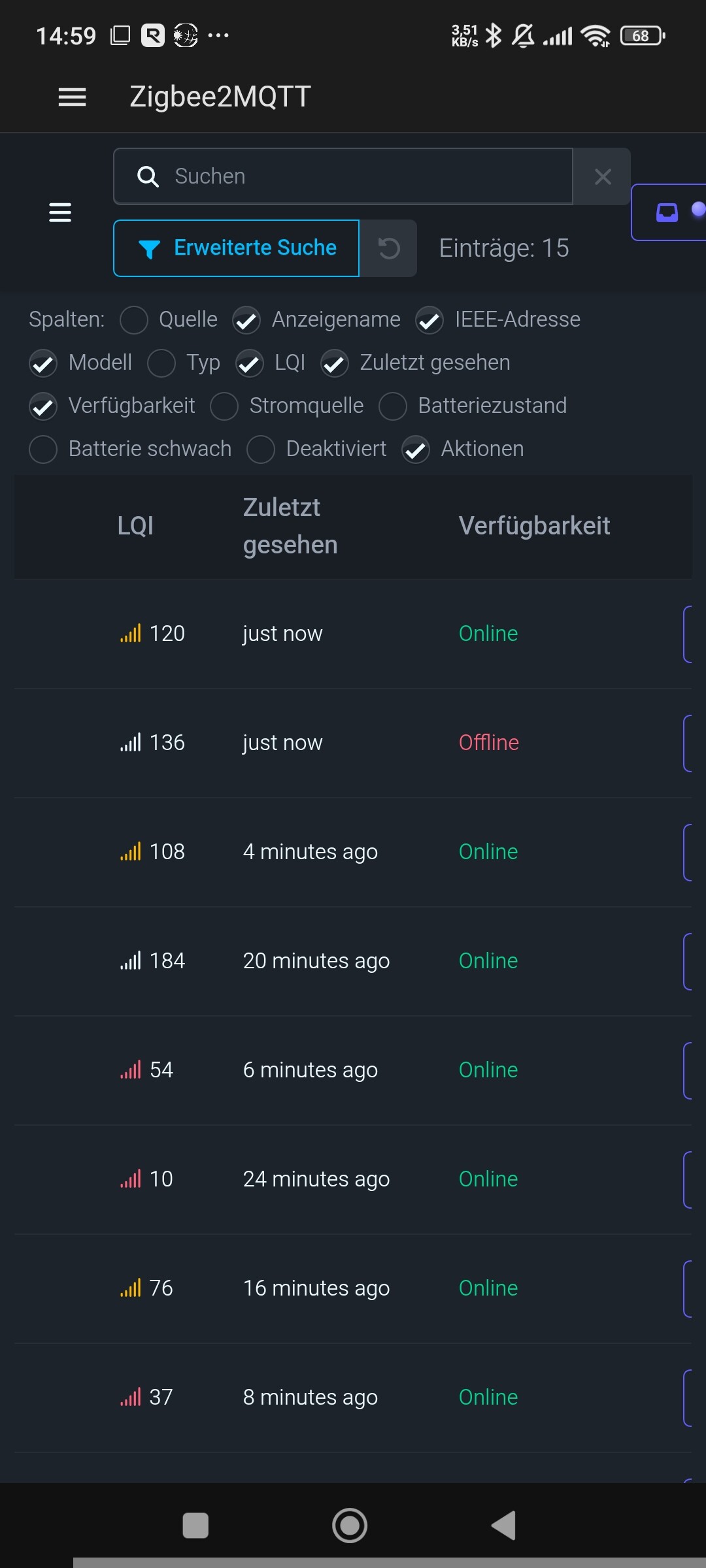In Zigbee2mqtt wird das GerĂ€t, wie immer, als offline angezeigt, lĂ€sst sich aber trotzdem bedienen und zeigt Aktualisierungen an. Aber fĂŒr einen Rauchmelder ist mir das zu unsicher. Sechs andere der gleichen Sorte laufen ohne Probleme.