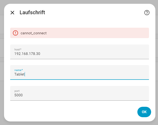 Es kommt kein connect zum Android Tablet zustande. Ich kann im browser aber den dort laufenden Server mit 192.168.178.30:5000 aufrufen und dort auch bedienen.