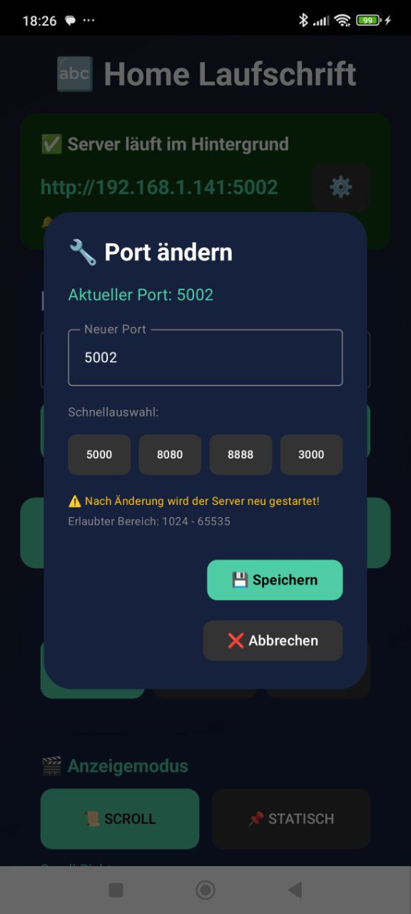 Die Port-Ănderung in der App brauchst du also wahrscheinlich gar nicht mehr, da der Zugriff ja prinzipiell klappt. Falls du es dennoch testen willst, ist hier die APK mit Port-Einstellungen: homeassistant-laufschrift/laufschrift_app/Port_Einstellungen/homelaufschrift.apk