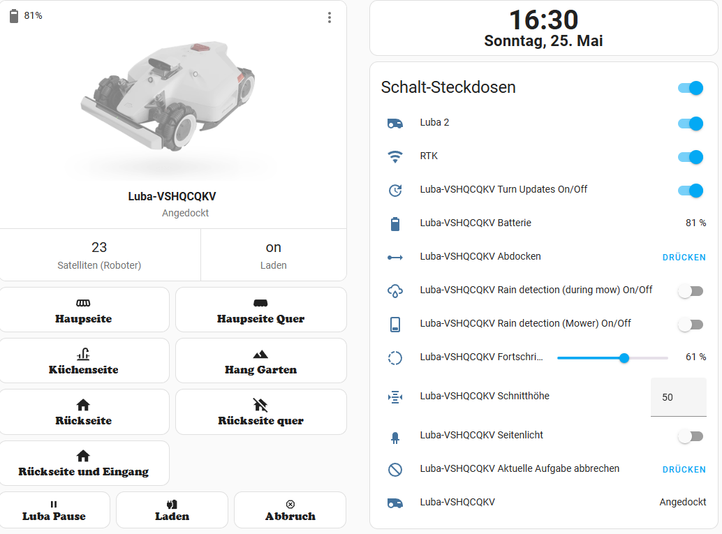 Ein Problem habe ich noch: Wenn ich den Robi per HA zurück in die Ladestation hole, fährt er zwar zurück, aber er unterbricht die Ausgabe nur und bricht sie nicht ab. Er steht dann also in der Ladestation mit dem Status: Pause.