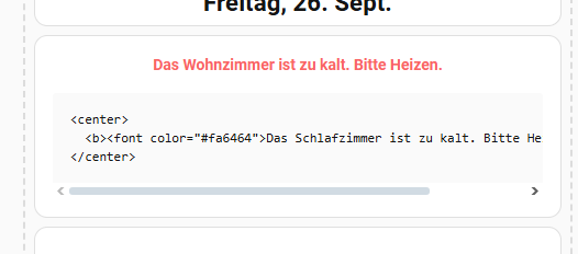 Er gibt zwar Warnungen von den Sensoren aus, aber wenn jetzt 2 Warnungen vorhanden sind, dann formatiert er den einen mit dem center und b Code etc. Aber die andere Warnung nicht.
