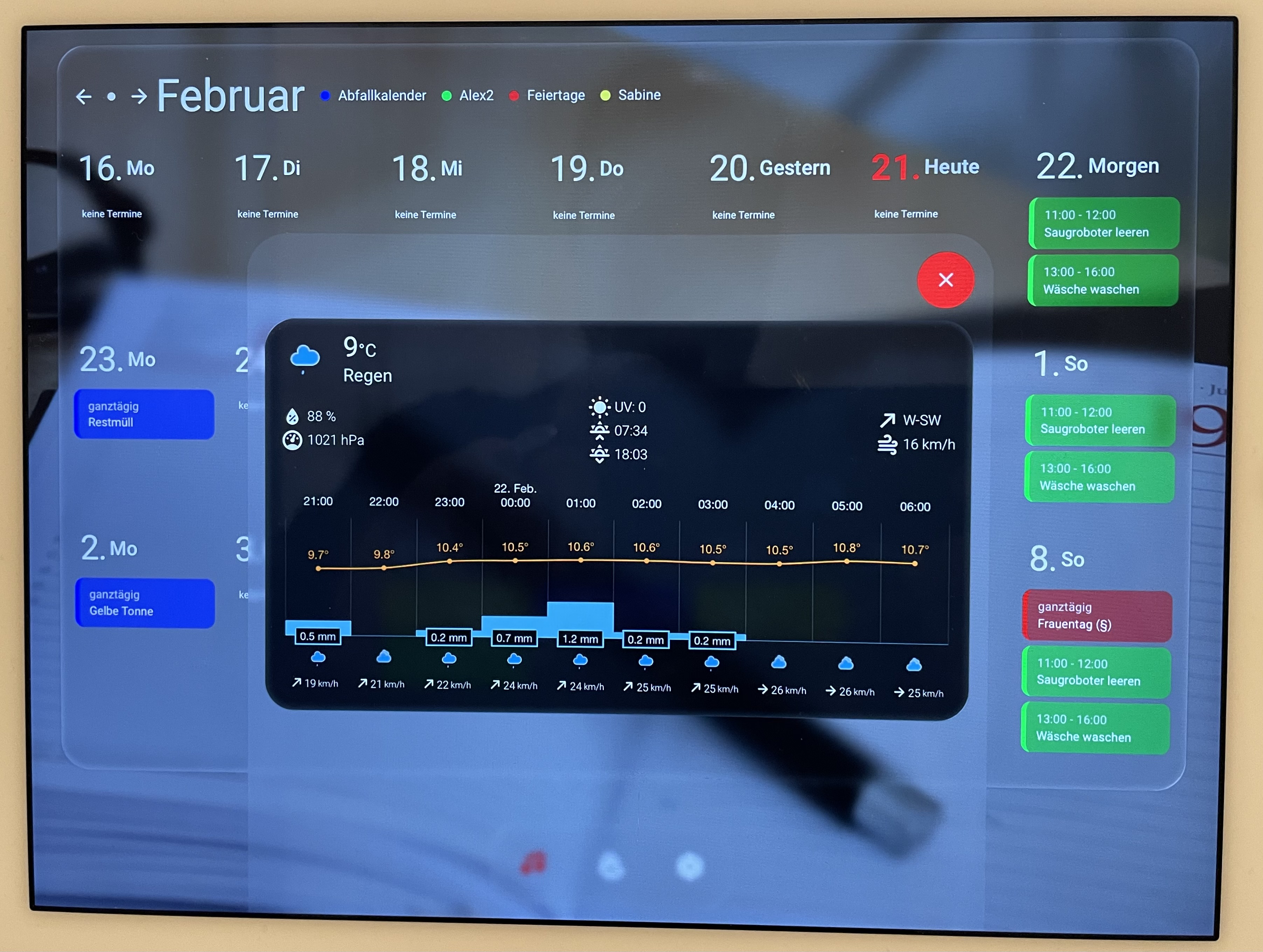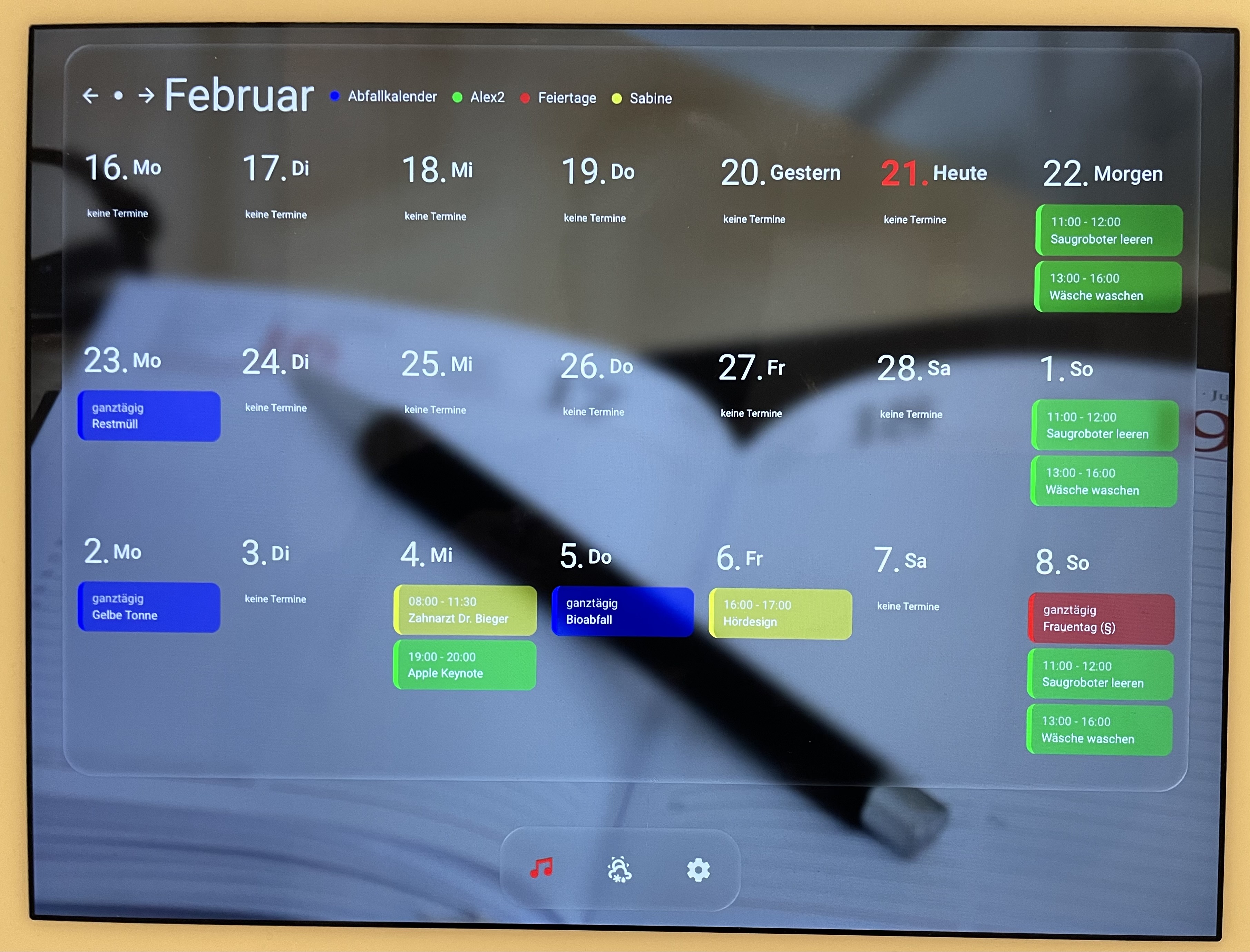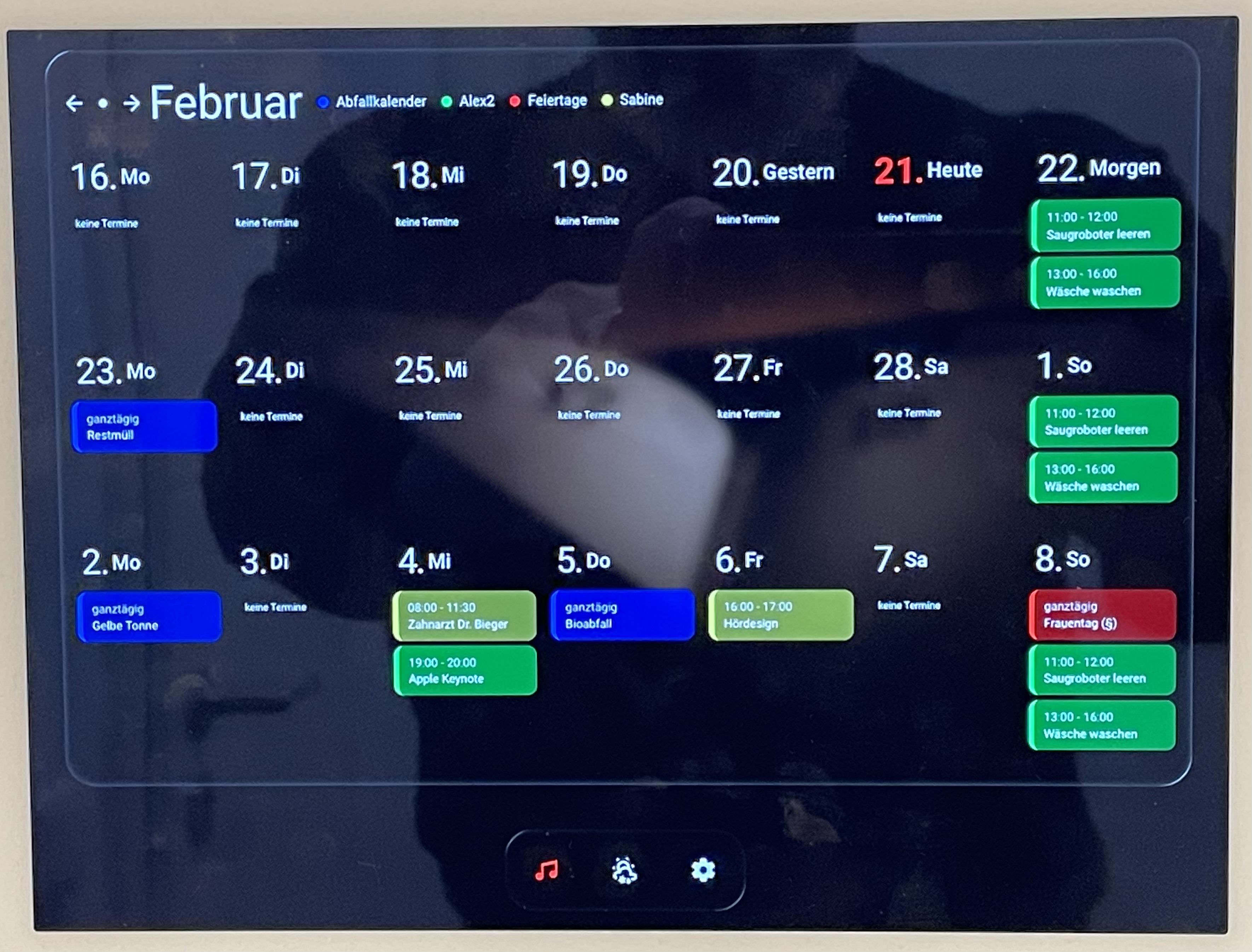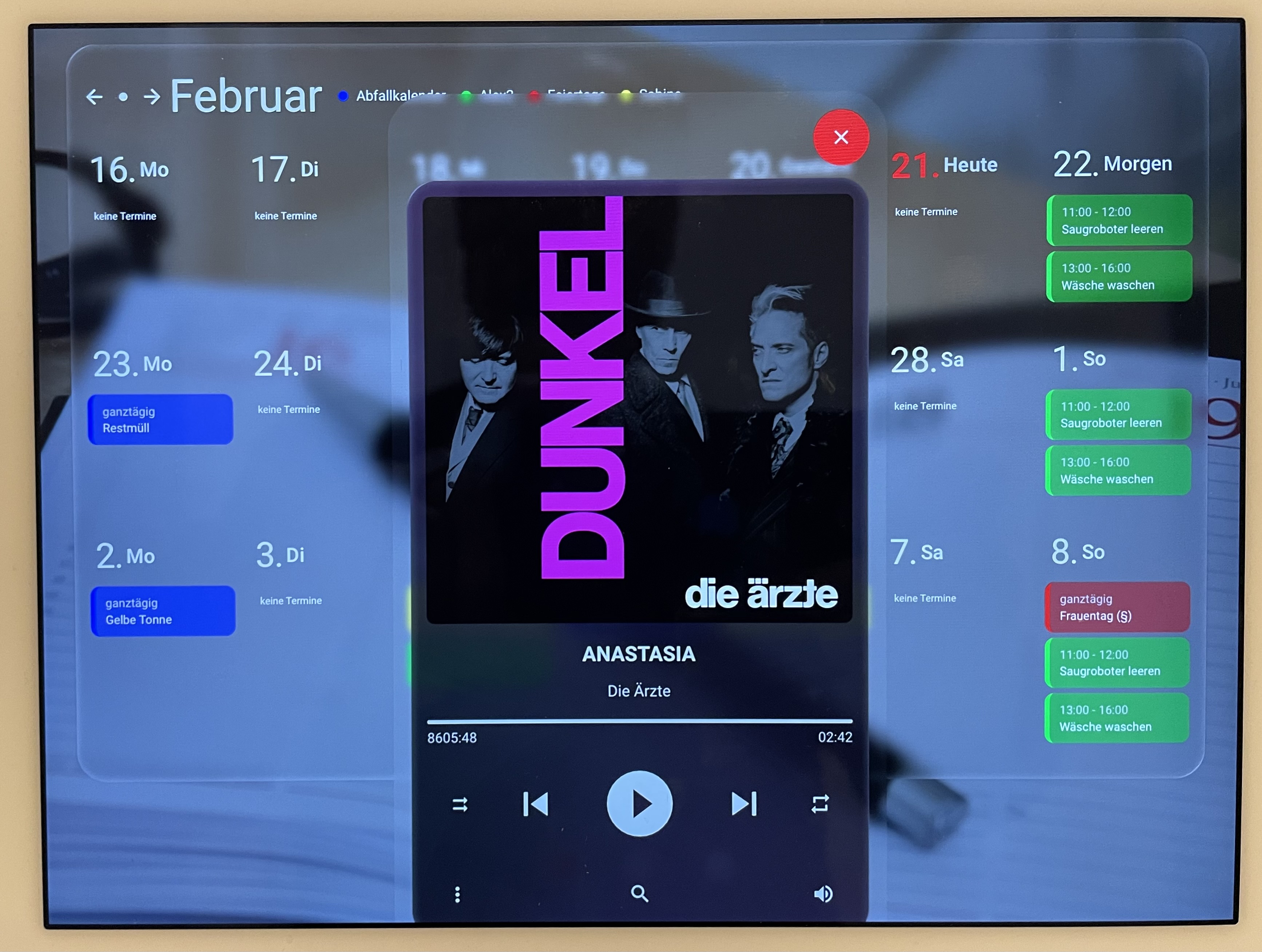 separates tablet (ipad air2) für kalenderanzeige und eintragserstellung inkl. musiksteuerung per musik-assistent (es scheitert derzeitig an der wiedergabe auf meine homepod.minis per airplay) mit wandmontage