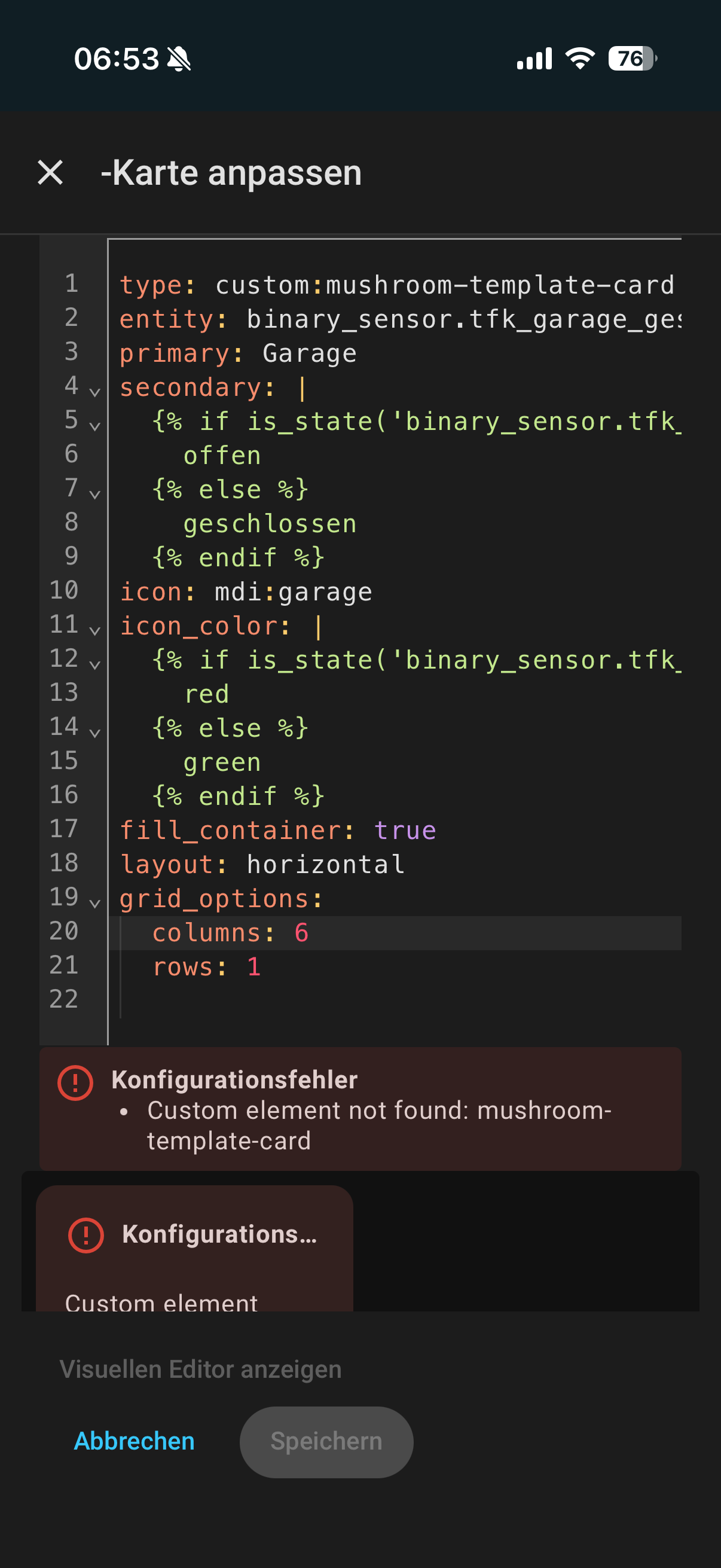 Nach dem gestriegen Mushroomupdate werden auf meinen Iphone meine Mushroom-Template Cards nicht mehr angezeigt. Auf den anderen Iphones in der Familie schon. Auch in diversen Browsern (Edge, Firefox) gibt keine Probleme.