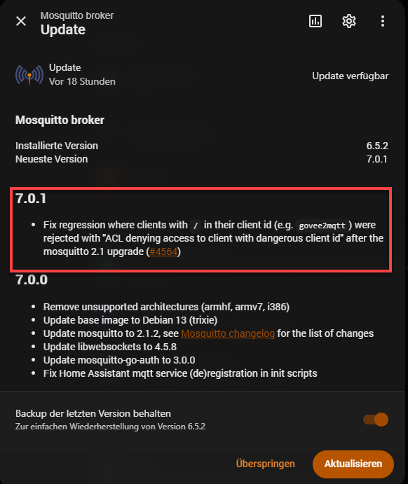 Sobald ich von der Version 6.5.2 das Update auf den Mosquitto broker 7.0.0 durchführe funktioniert die Govee to MQTT Bridge nicht mehr. Im Protokoll des Brokers wird nur noch diese Fehlermeldung ausgegeben: