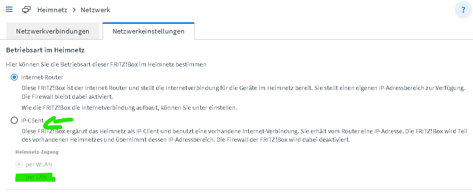 So bin gerade erst wieder zu Hause, jetzt konnte ich mal in meiner Fritzbox schauen. Ich habe bei mir zwei Xiaomi AX3000 im Einsatz, die machen das automatisch. Bei der Fritzbox muss man soweit ich weiß noch den IP Client für LAN aktivieren, habe gerade mal bei mir in der Fritzbox geschaut.
