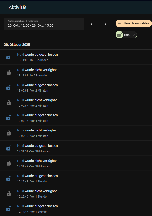 In der Nacht beruhigte sich das wieder und am Sonntag ging es dann weiter das ich laufend die Meldung „Alarm deaktiviert“ bekomme. Im Verlauf der Aktivitäten vom Nuki ist mir dann aufgefallen das sich alle Nase lang der Status ändert und immer wenn der Status „Nuki wurde aufgeschlossen“ erscheint, auch die Meldung „Alarm deaktiviert“ auf meinem Phone erscheint. Ich könnte ja jetzt einfach meine Automation ändern so das keine Meldung mehr auf mein Handy erscheint, aber das kann ja nicht die Lösung sein.