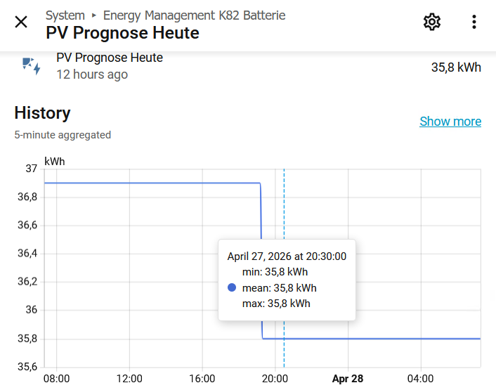 Und ja, der zugeordnete Solcast Sensor ist heute Nacht um 0:00:05 Uhr von 34.66 auf 22.93 kWh gesprungen, “PV Management Battery” - “PV Prognose heute” sagt aber immer noch 35.5 kWh.