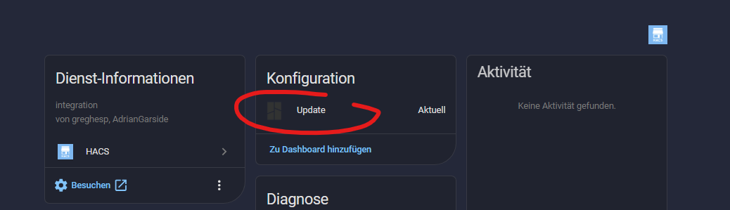 Mahlzeit, geht eigentlich ganz einfach. Wähle in den Einstellungen den Punkt Geräte&Dienste und dort dann unter Geräte nach der gewünschten Integration suchen. Einer der Punkte ist dann update oder HACS. Hier im Beispiel ist der es der letzte Eintrag in der Liste.
