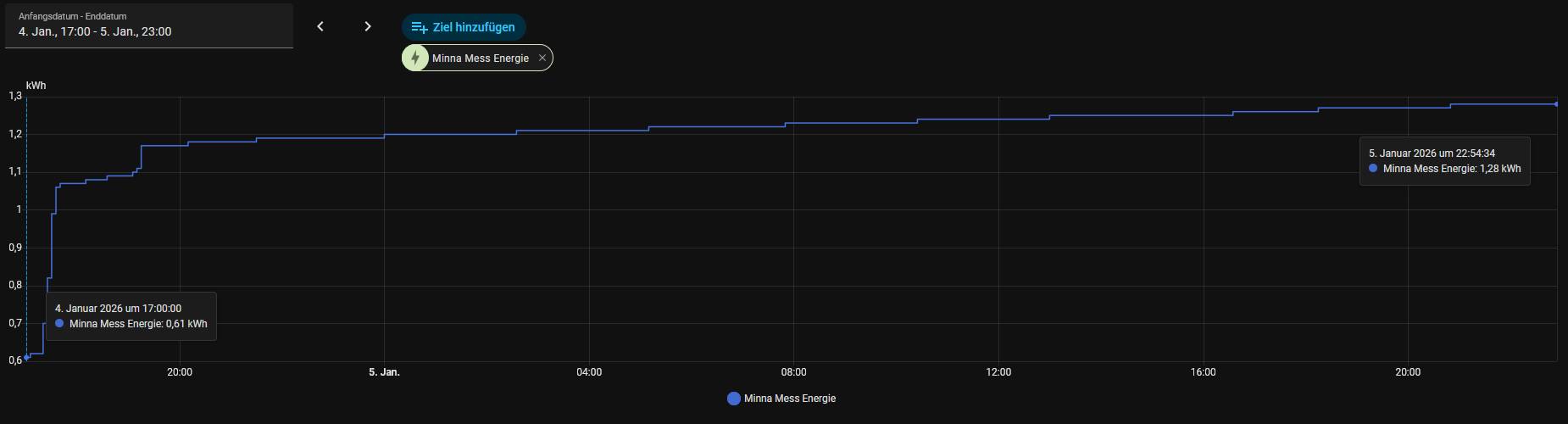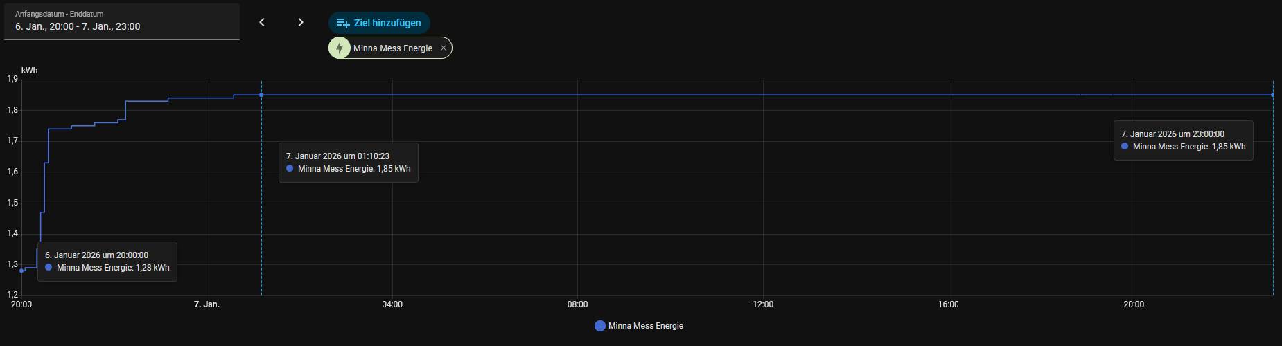 Diese Mal aber gibt es keinen Standby-Verbrauch und der Stecker zeigt weiterhin 1,85 kWh an. Über die gasamte Zeit eine Flatline und keine Stufen.
