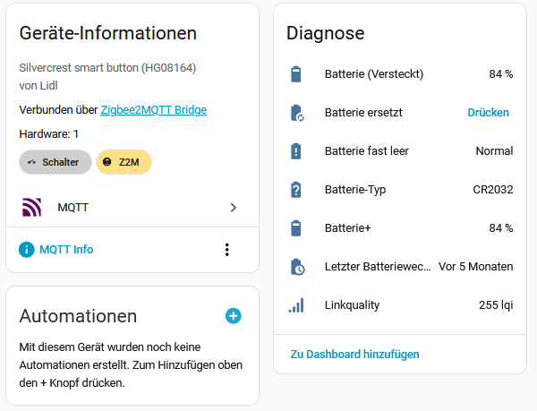 okay, wie hast du den Silvercrest Button integriert? per ZHA (Zigbee Home Assistant) oder per Zigbee2MQTT?