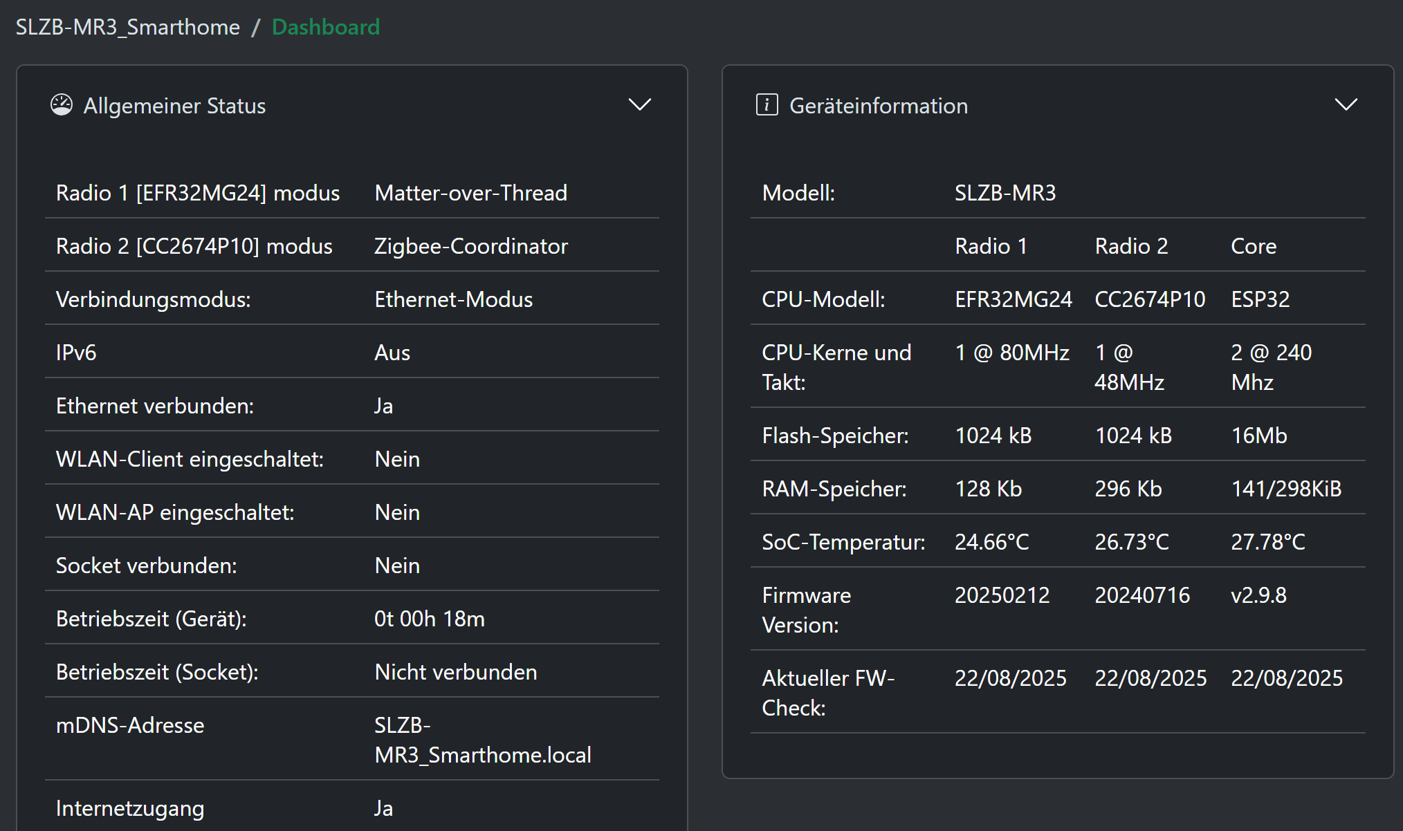meine Erkenntnis heute war auch, dass der SLZB-MR3 bei mir als Zigbee Router nur mit dem EFR32MG24 Chipsatz (und nicht wie oft empfohlen mit CC2674P10) funktioniert hat - vielleicht hilft es jemanden.