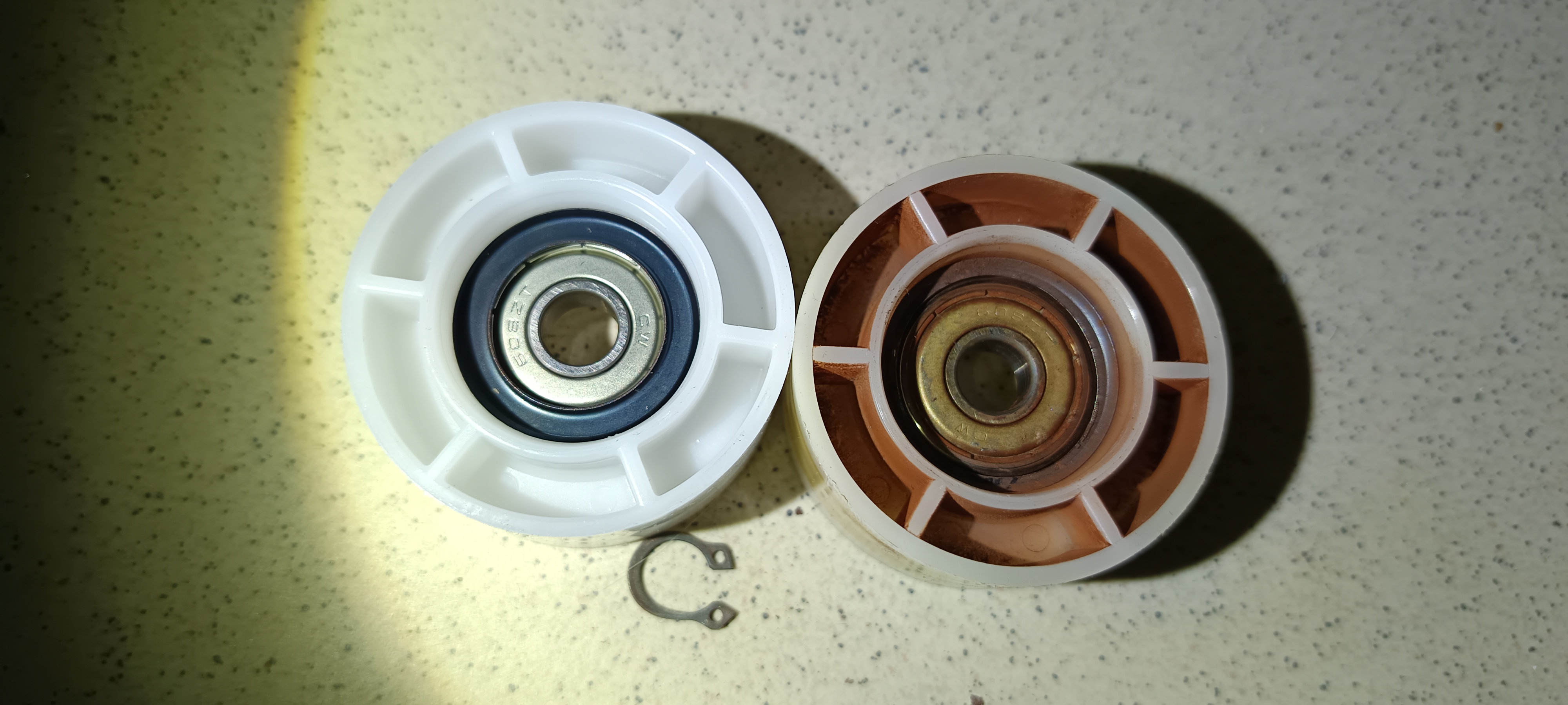 Die alte Rolle zu entfernen war kein Problem, aber den Sprengring der neuen Rolle über die Welle zu ziehen hat fünf Minuten gedauert. Ist wirklich eng, wenn man mit Werkzeug in dem Trockner arbeitet.