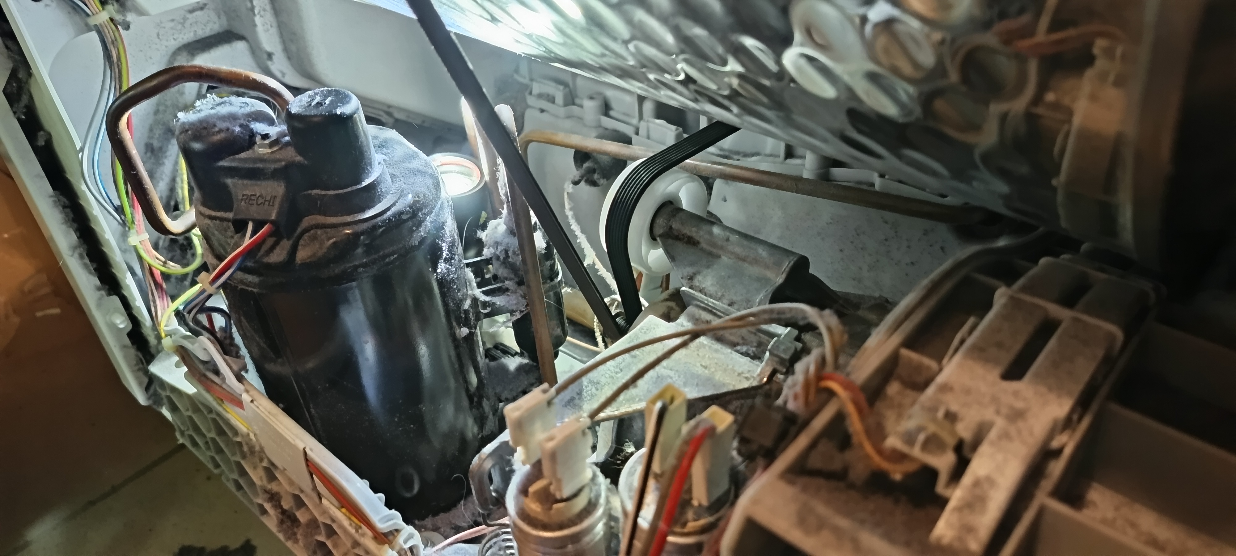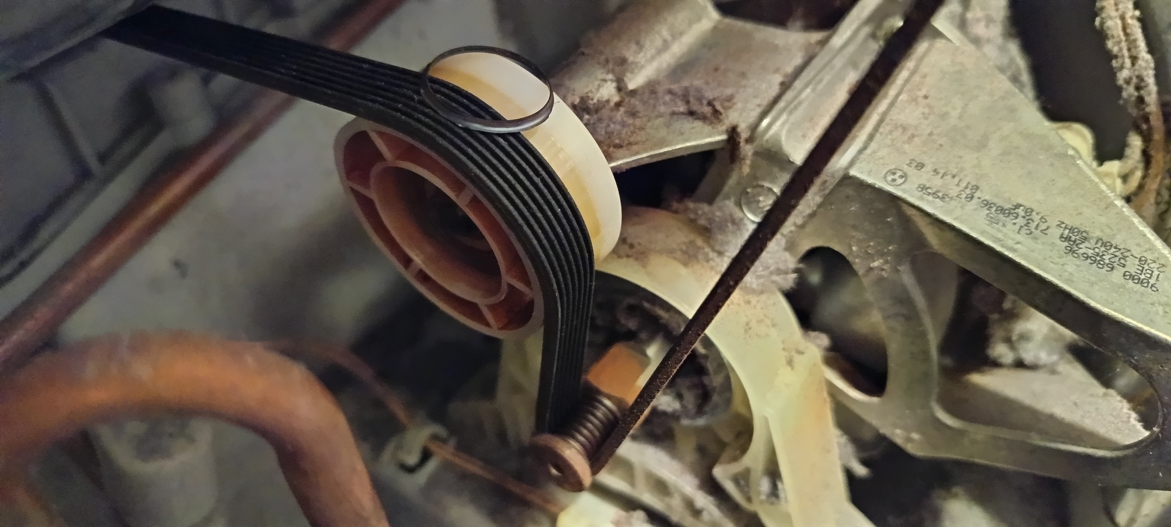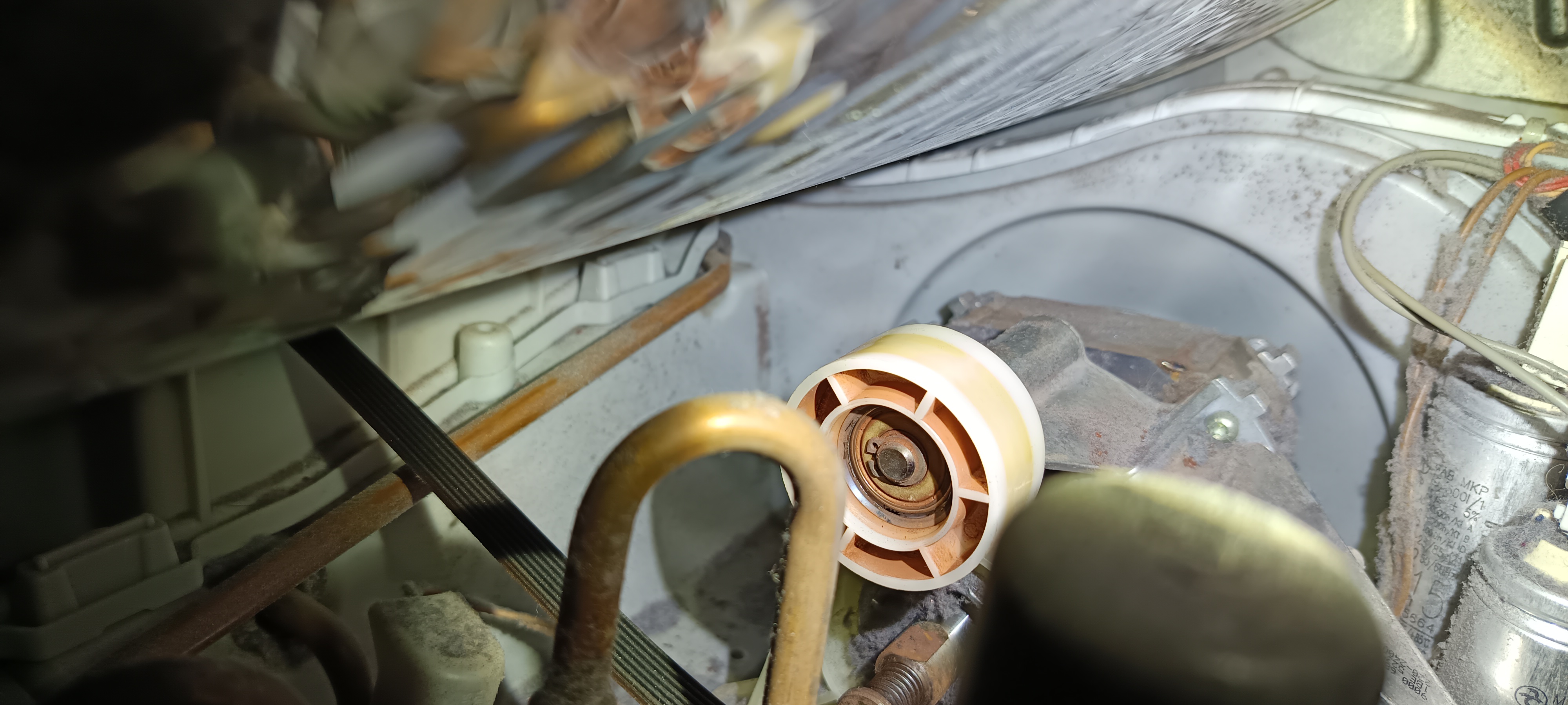 Ein Lagerschaden an der weißen Rolle des Riemenspanners. Den Ring habe ich weiter unten in der Maschine gefunden und war mal ein Teil des Kugellager.