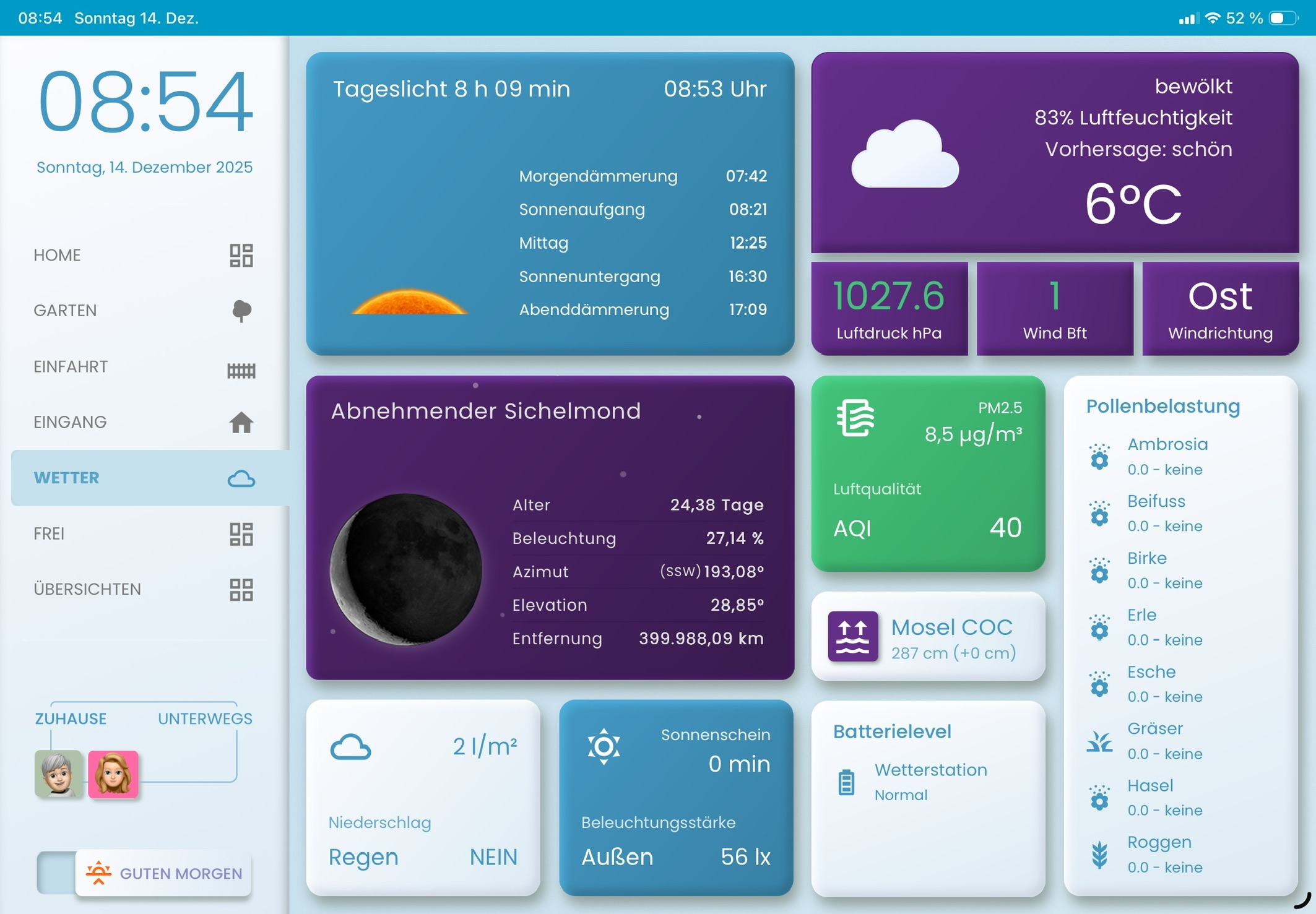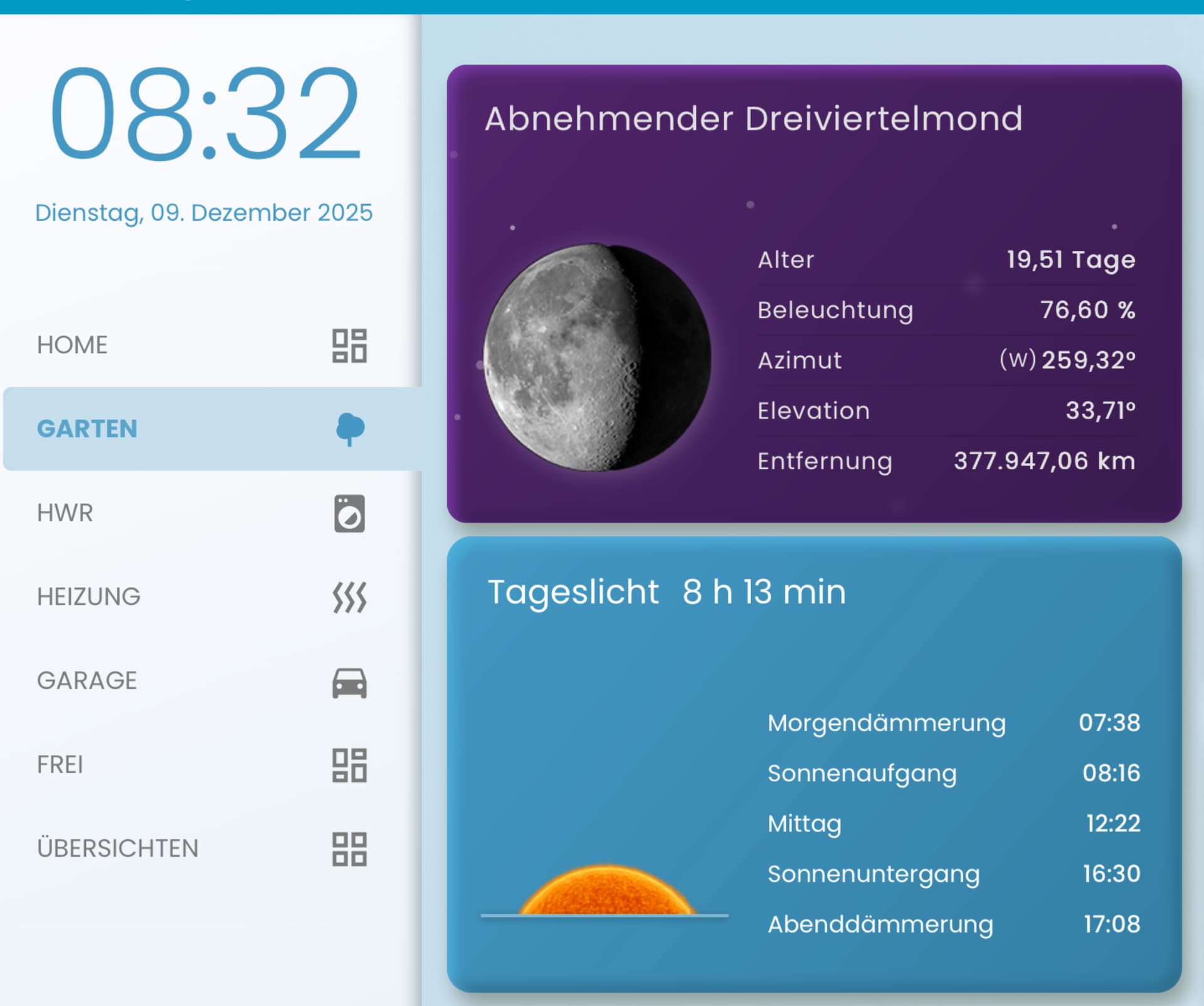 Die Idee dahinter ist die Elevation zu nutzen um die Sonne je nach Stand über den Horizont zu schieben. Bei Noon sollte die Sonne dann voll zu sehen sein. Da liegt aber der Haken: die max-Elevation hier bei uns ist so um die 67°, das wird im Winter ja nicht erreicht. Deshalb ist das Bild am Mittag nicht voll zu sehen