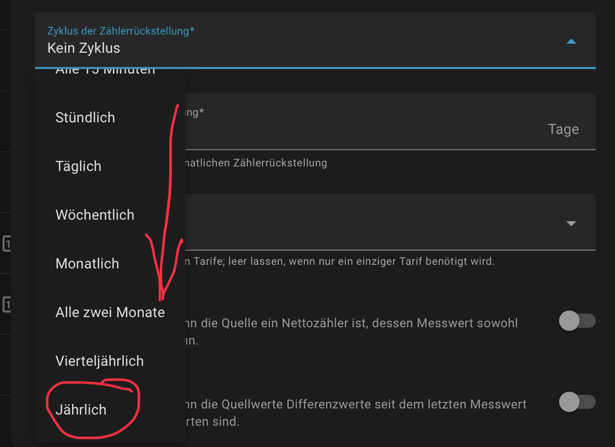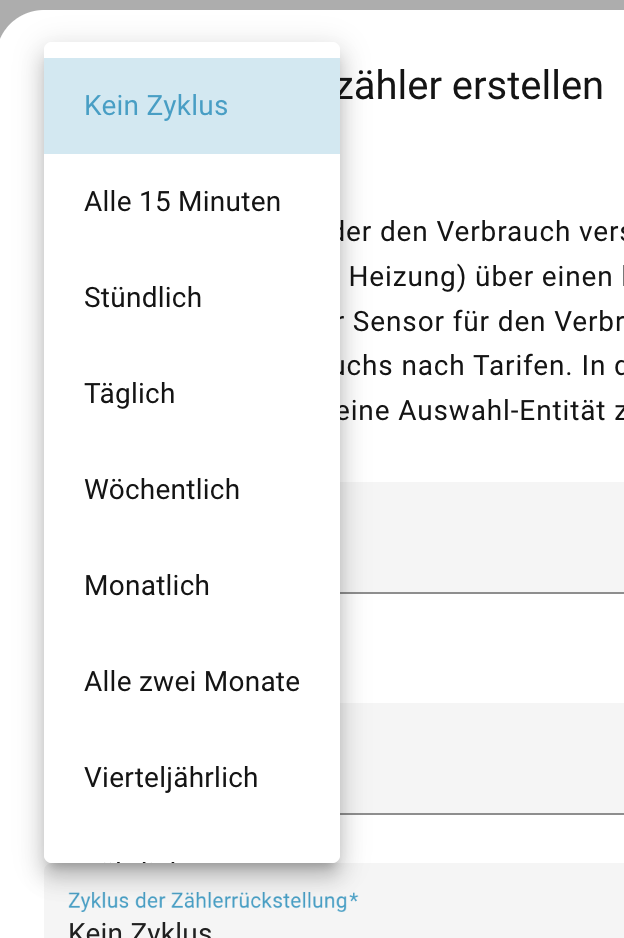 Zyklus der Zählerrückstellung: Wähle hier den gewünschten Zyklus: täglich, wöchentlich, monatlich oder jährlich.