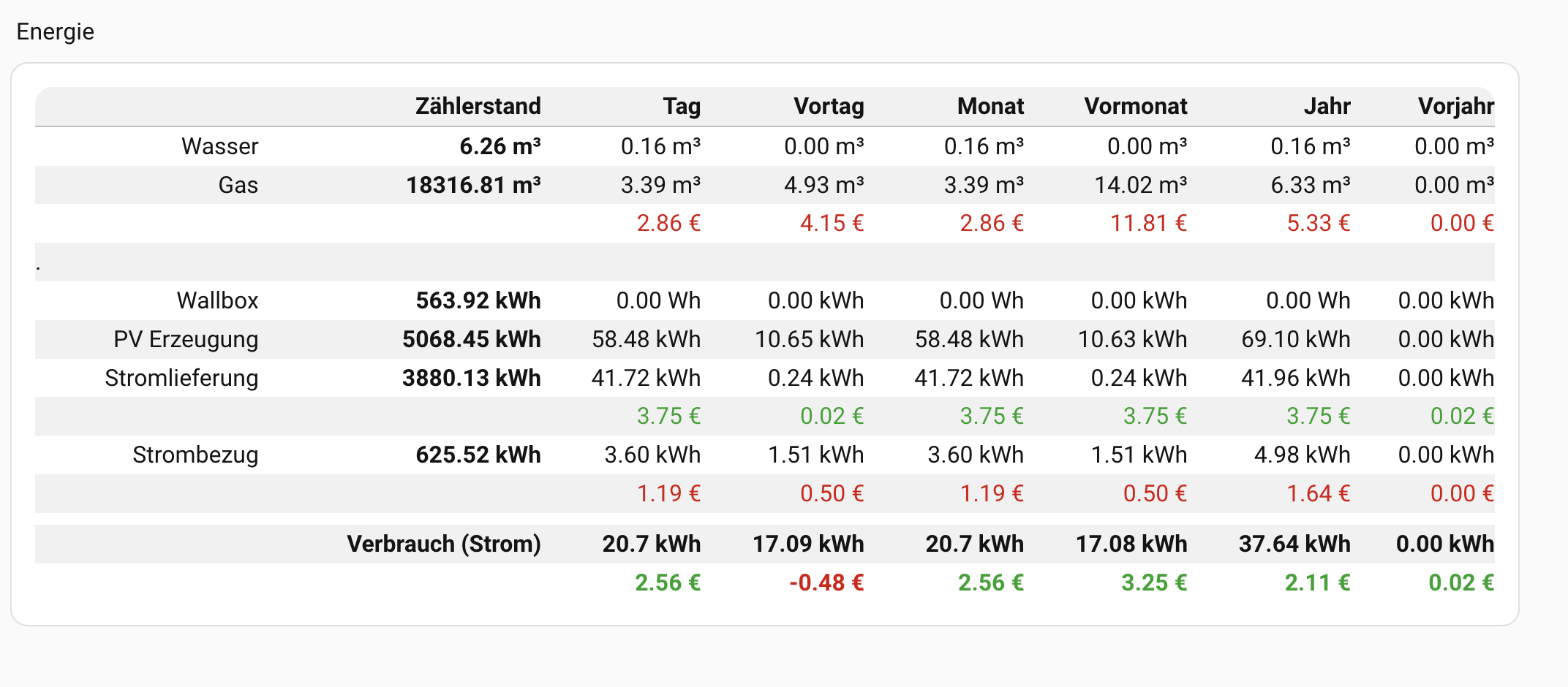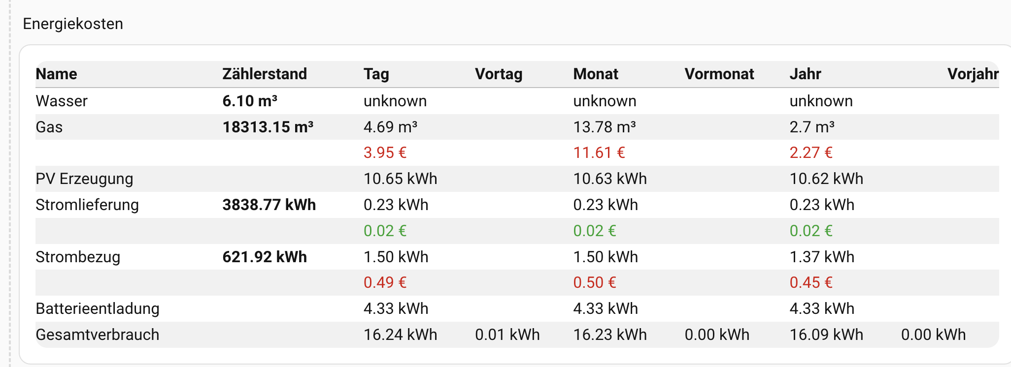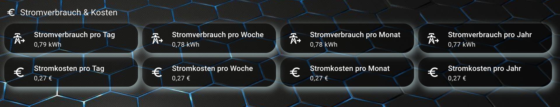 Dazu noch Template Helfer als Sensor. Jeweils für Tag,Woche,Monat,Jahr die mir dann den Verbrauch als € anzeigen