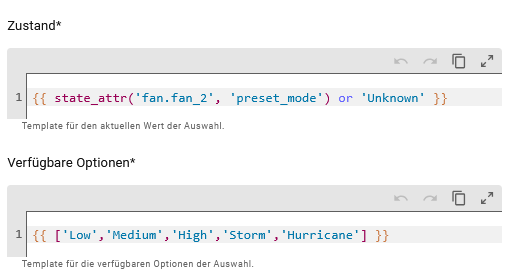 ich habe übrigens einen template select Sensor (select.fan_2_preset) verwendet, keinen input_select helper.