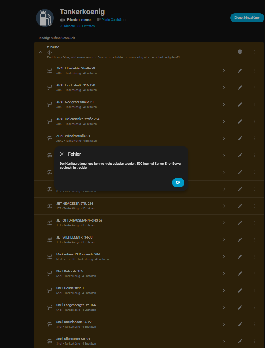 hat noch jemand aktuell Probleme mit dem Tankerkönig? Bei mir zeigt die App in HA einiger Zeit keine Verbindung mehr an und aktualisiert auch die Daten nicht.