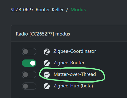 Er ist natürlich in meinem Netzwerk und als Modus „Matter-over-Thread“: