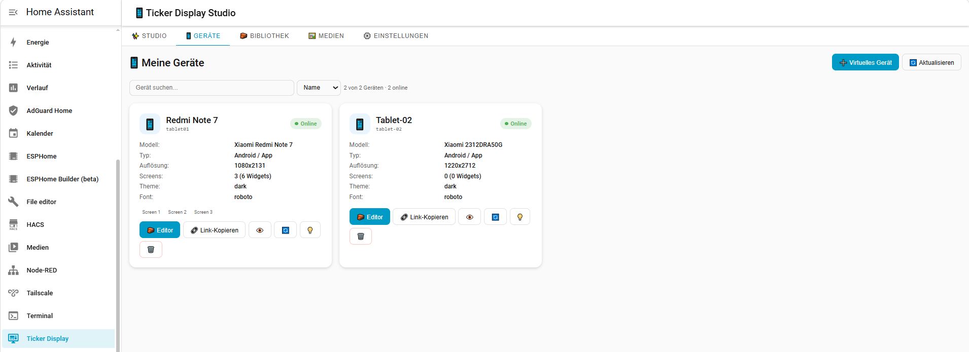 ich wollte schon länger ein Display bei mir einsetzen, habe aber nie wirklich etwas gefunden, das genau zu meinen Vorstellungen gepasst hat. Vieles war am Ende einfach nur ein Kiosk-Browser mit einer geöffneten Lovelace-Seite. Das kann natürlich funktionieren, aber ich wollte etwas, das deutlich tiefer in Home Assistant integriert ist.