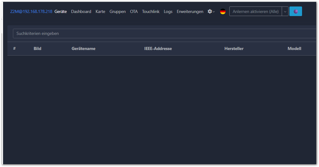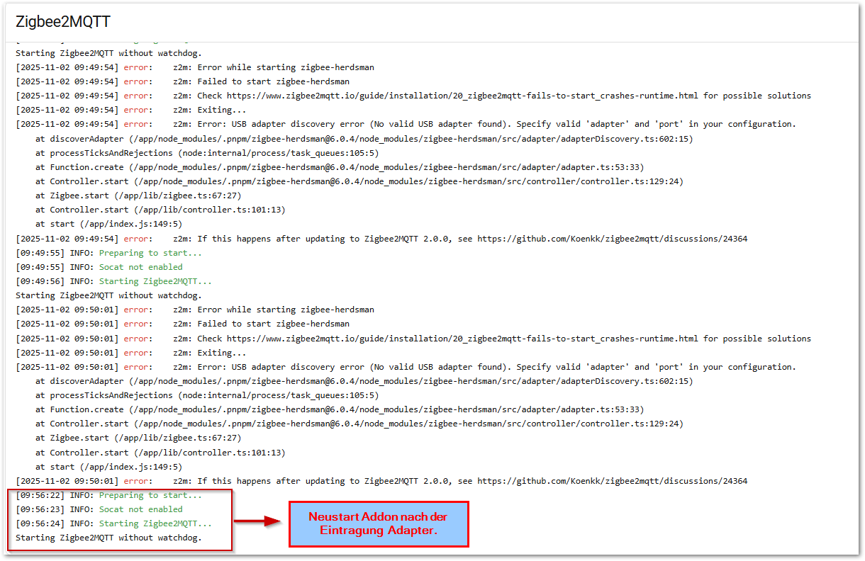 Seit dem Absturz hat Zigbee2MQTT keine Funkbasis mehr, deshalb können sich auch keine neuen Geräte pairen.