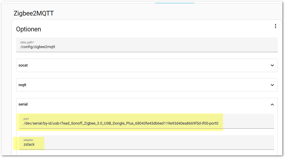 Einstellungen → Add-ons → Zigbee2MQTT → Konfiguration → Serial