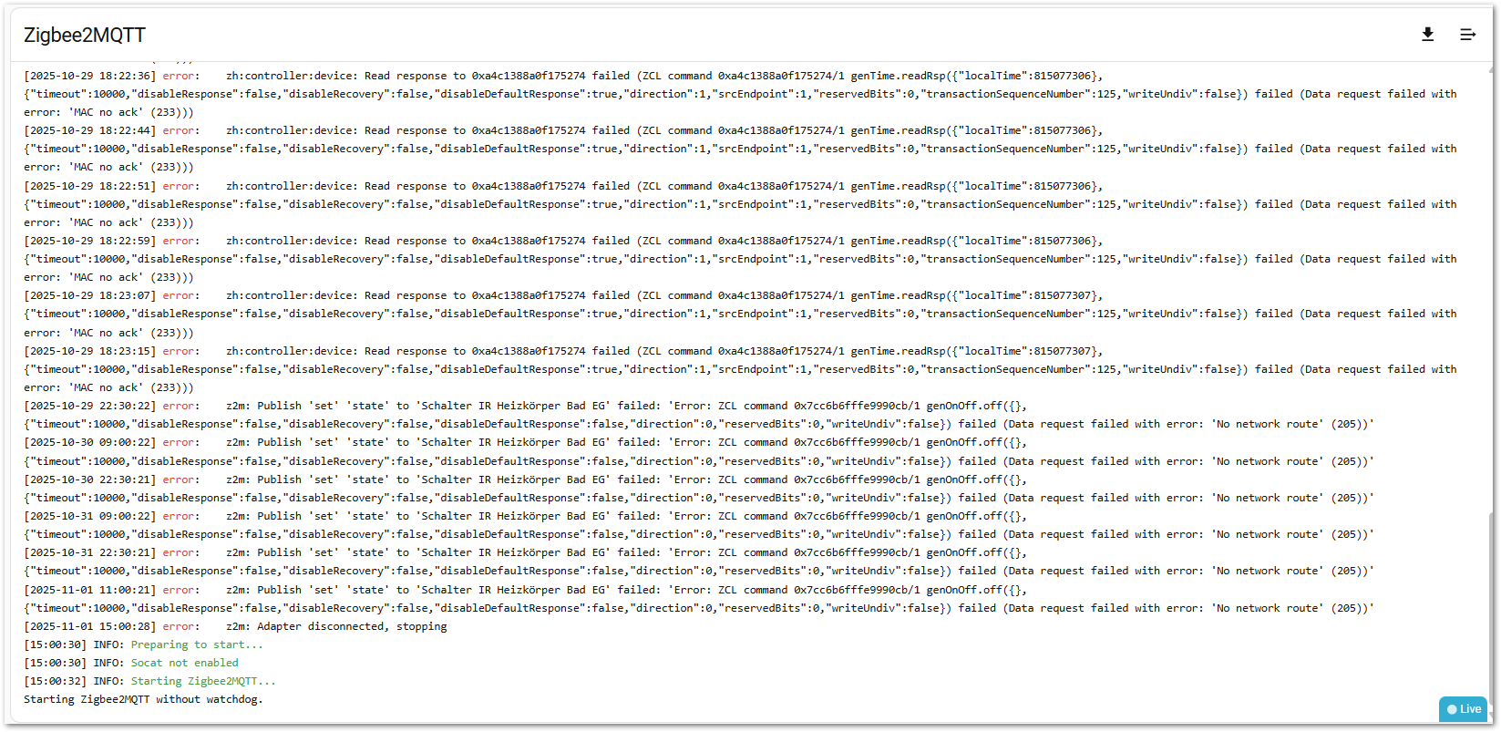 Der Koordinator (Sonoff ZBDongle-P) selbst ist abgestürzt und wurde vom System getrennt