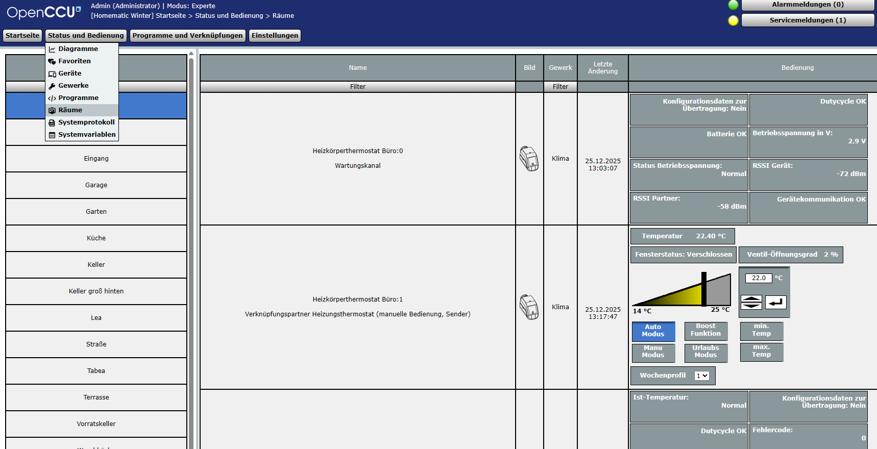 Dann die Geräte / Kanäle miteinander verknüpfen und tadaaa! Du hast in OpenCCU eine Heizungsgruppe und kannst in “Status und Bedienen / Räume” deine Heizgruppen schon bedienen.