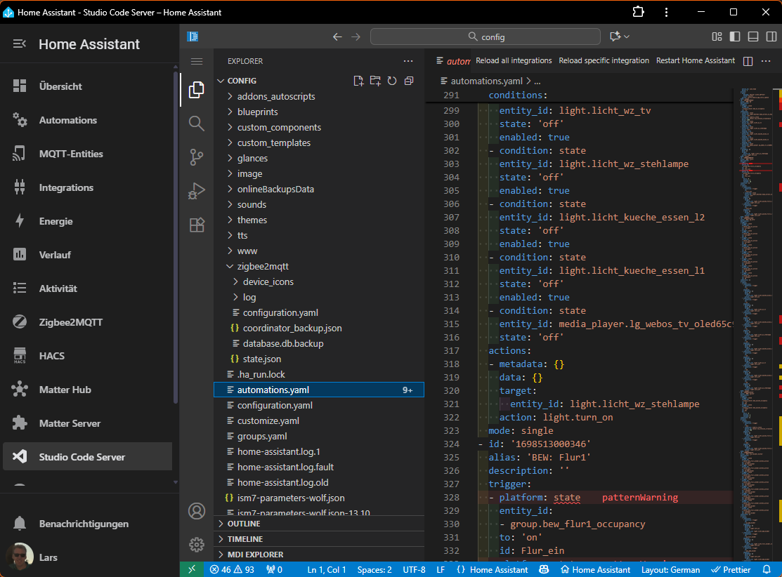 Ich habe ein Update von Studio Code Server 5.19.3 auf 6.0.0 gemacht. Jetzt ist meine automations.yaml voll mit Fehlermeldungen (mehr als 100). Bin erst mal wieder zurück auf 5.19.3, und Fehler sind weg. Muß ich etwas beachten, oder ändern, da auf 6.0.0 ein großer Sprung ist.