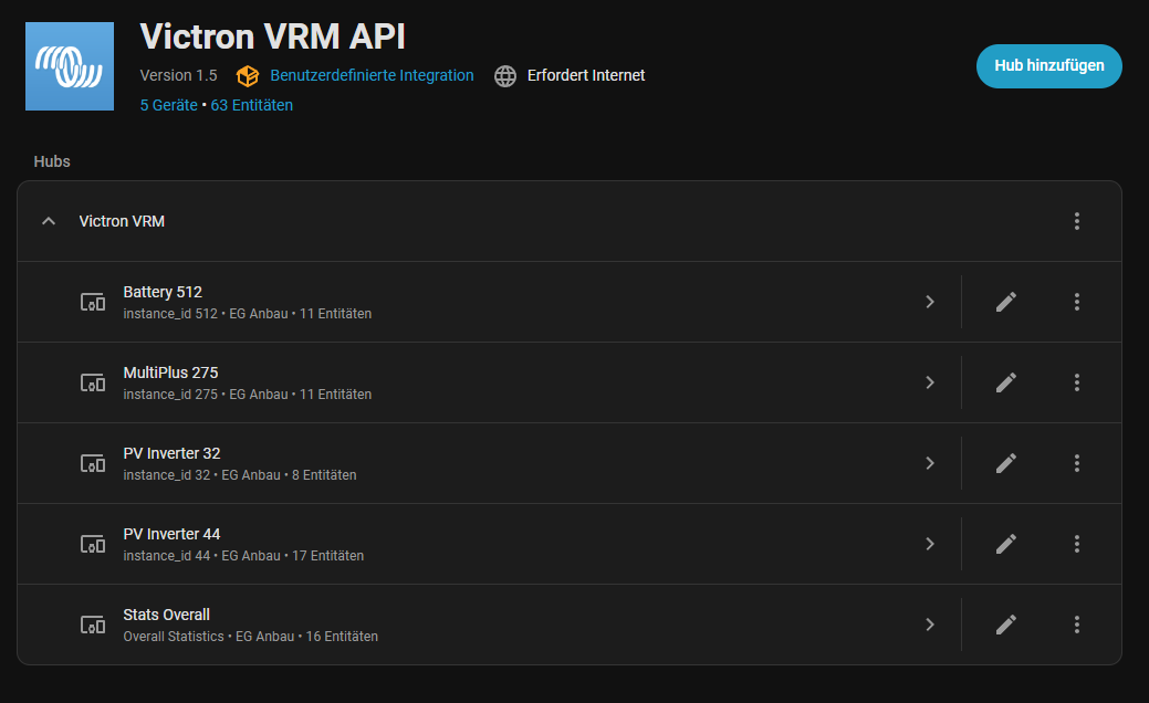 Mahlzeit, ich werde schauen, dass ich die Integration dahingehend erweitere, dass man mehrere PV Inverter und Batterien anlegen kann. Ich habe zwar auch mehrere PV Inverter, aber die fasse im VenusOS über NodeRed zu einem virtuellen PV Inverter zusammen.