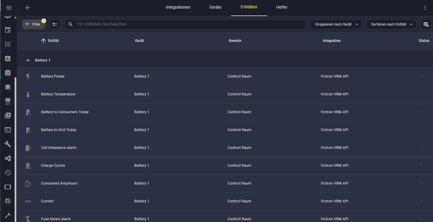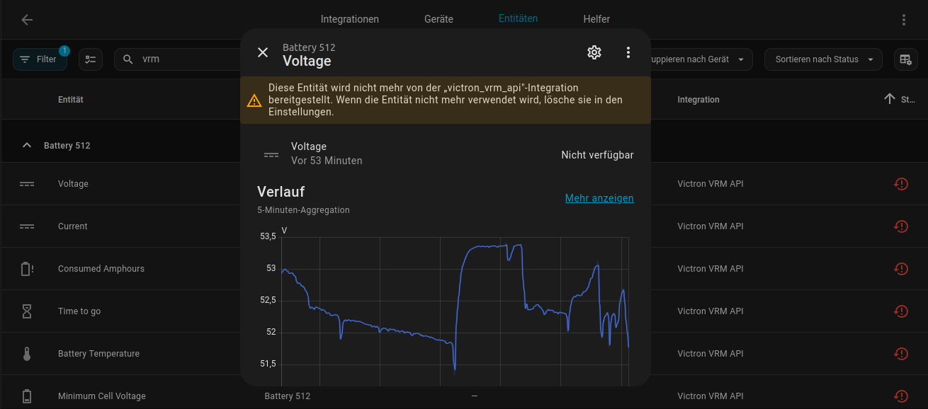 „Diese Entität wird nicht mehr von der „victron_vrm_api“-Integration bereitgestellt. Wenn die Entität nicht mehr verwendet wird, lösche sie in den Einstellungen."