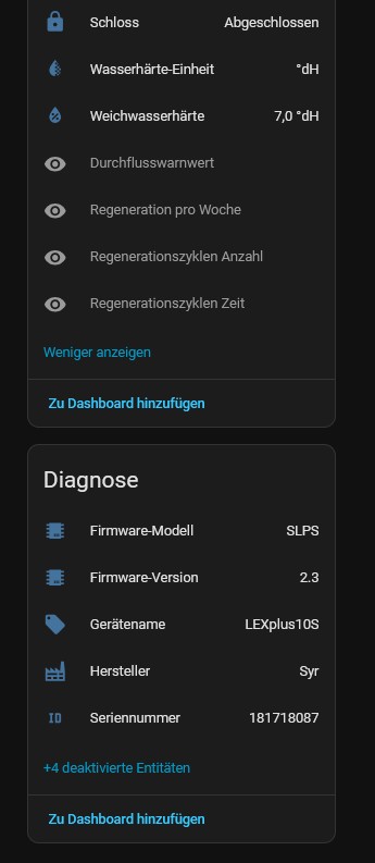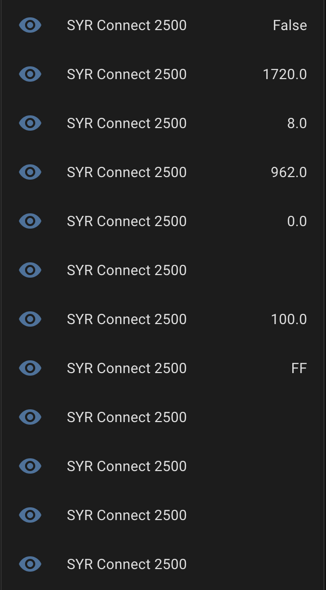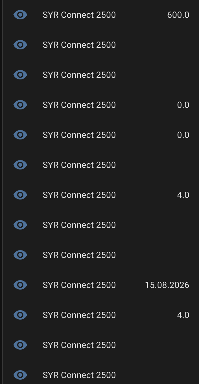 Die Integration syr_connect funktioniert. Da die Anlage laut Entwickler “Not tested” beschrieben wird habe ich es einfach getestet. Zu den Entiäten mit denen man was anfangen kann sind eine Menge bei wo ich nichts mit anfangen kann bis jetzt ![]()