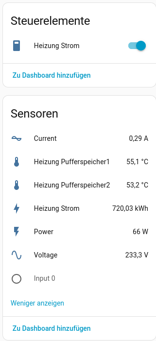 Nur damit wir nicht aneinander vorbei reden. Der Shelly 1PM kann den Verbrauch messen und den Heizstab Schalten. Das Shelly Addon wird als Zusatzhardware hinten auf den Shelly 1PM aufgeclipst und erweitert dann den Shelly 1PM um die Möglichkeit dort, unter anderem, DS18B20 als Sensoren zu betreiben. Das Addon macht den Shelly zuzusagen zur eierlegenden Wollmilchsau. Ich messe in dieser Kombination den Stromverbrauch meiner Gasheizung und gleichzeitig mit zwei DS18B20 die Temperatur meines Warmwasser Pufferspeichers an zwei verschiedenen Stellen. Bei mir taucht das dann in HA so auf, und ich bin mir ziemlich sicher das es genau das ist was du möchtest um es weiter zu verarbeiten.