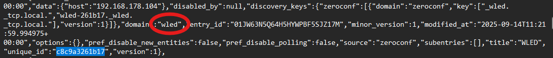 Da war dann der Eintrag „disabled_by“:null" nicht mehr „null“ sondern „config_entry“.