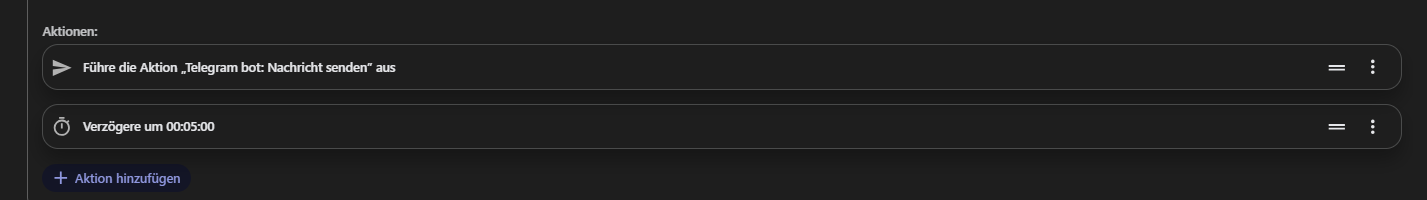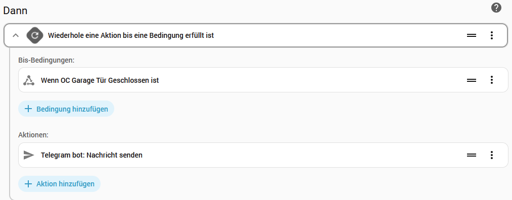 Nun haben wir das Problem, dass das Tor manchmal klemmt und nicht richtig schließt. Deswegen würde ich gerne regelmäßig einen weiteren Hinweis bekommen, wenn das Tor immer noch offen ist. z.B. alle 5 Minuten.