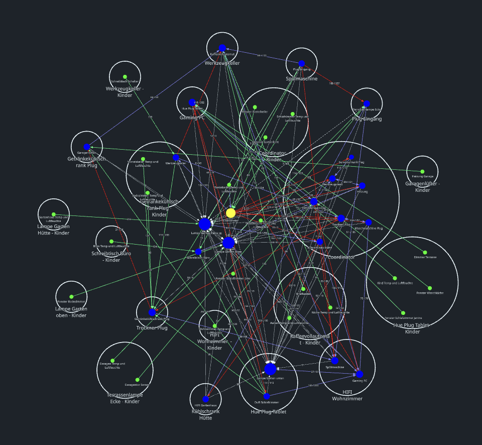 Das Zigbee Mash Netzwerk verwaltet sich alleine. Auch habe ich die Erfahrung gemacht, dass diese Darstellung nicht komplett ist. Es bestehen meist mehr Verbindungen zwischen Geräten als hier dargestellt.