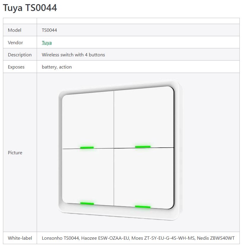 Spannend. Ich habe die Schalter auch, von Moes, werden auch als Tuya TS0044 (spezifischer - _TZ3000_wkai4ga5) erkannt - bisher hat sich da keiner von den anders ausgegeben Hätte gedacht dass so was evtl durch eine Änderung in den Modellzuordnungen beim Update von Z2M passieren kann, das würde aber eher alle von den Geräten auf einmal betreffen und nicht nur einen. Evtl verschiedene Firmwareversionen drauf oder so was?