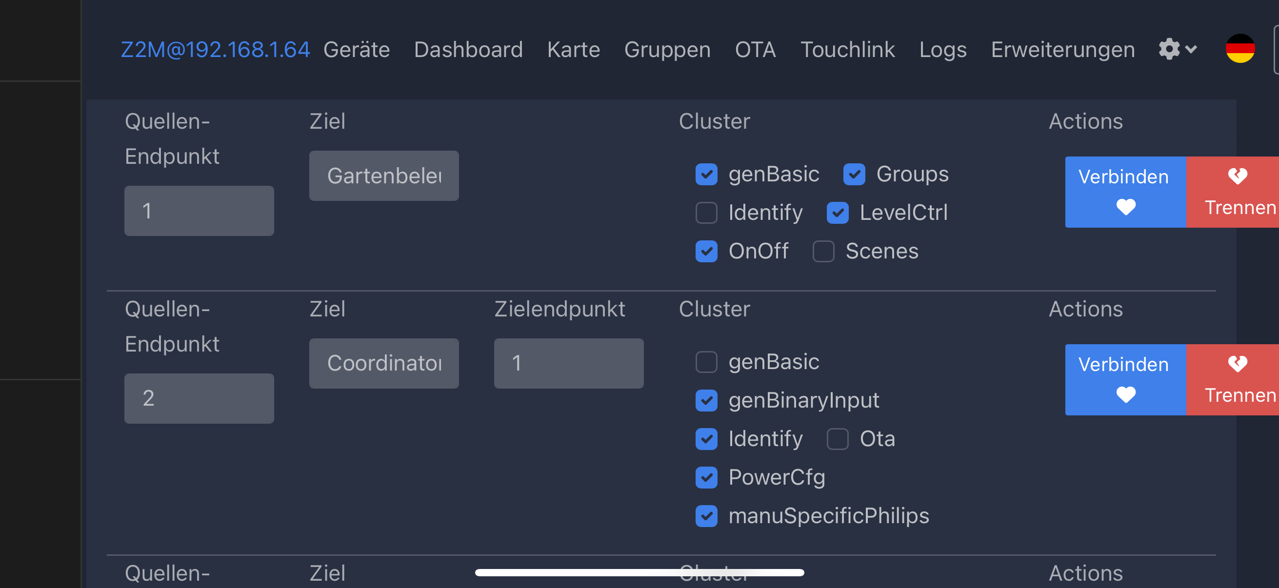 Mein Vorhaben ist einfach das ich die Geräte so einstellen kann, damit auch bei Serverausfall sich die Steuern lassen können. Sprich Home Assistant bzw. Zigbee2MQTT ist nicht erreichbar und dennoch möchte ich Lichter schalten können.